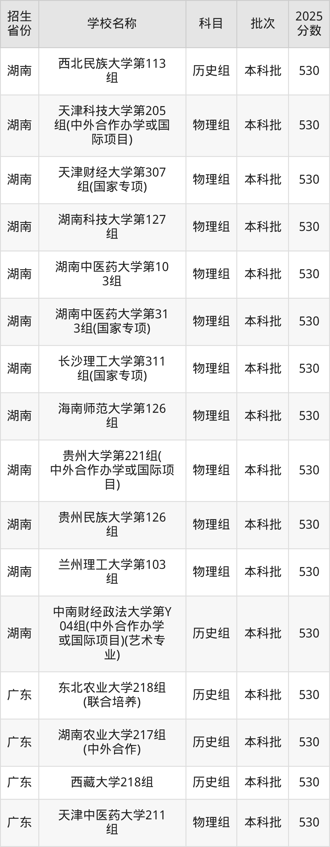 广东省历史组分数线是530分的重点大学有:东北农业大学、湖南农业大学、西藏大学。