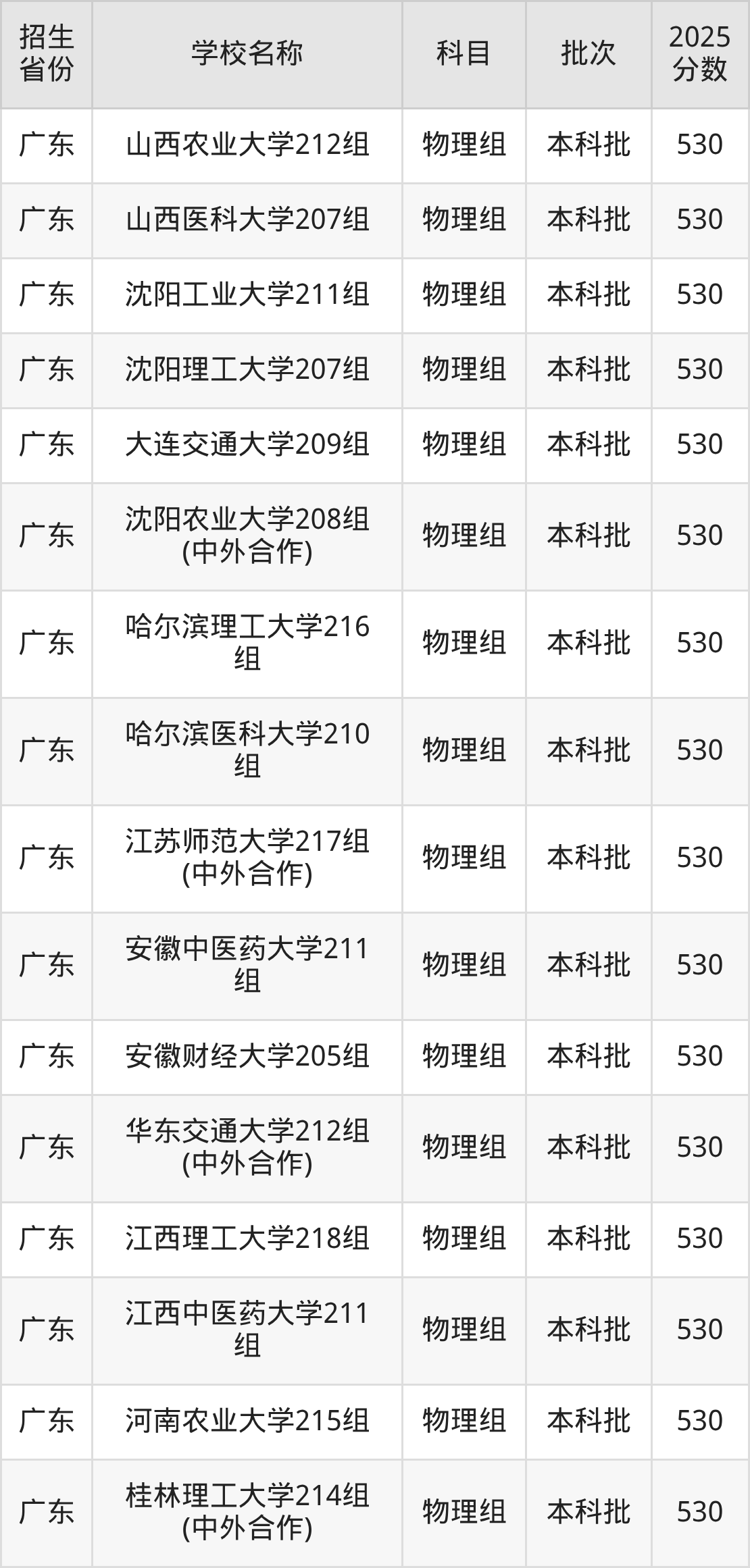 广东省物理组分数线是530分的重点大学有:天津中医药大学、山西农业大学、山西医科大学、沈阳工业大学、沈阳理工大学、大连交通大学、沈阳农业大学、哈尔滨理工大学、哈尔滨医科大学、江苏师范大学。