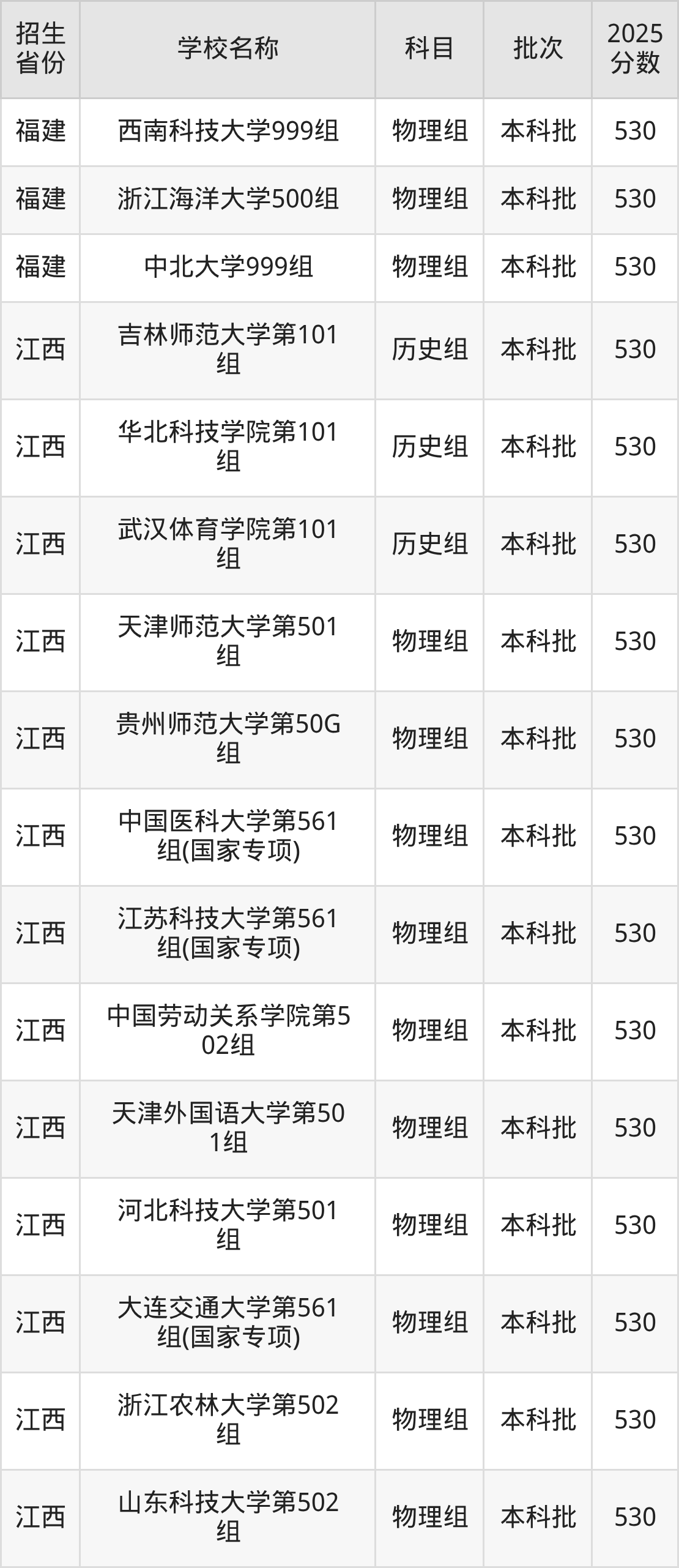 江西省历史组分数线是530分的重点大学有:吉林师范大学、华北科技学院、武汉体育学院。