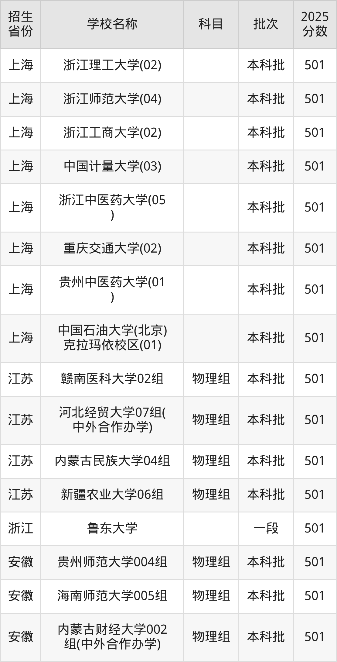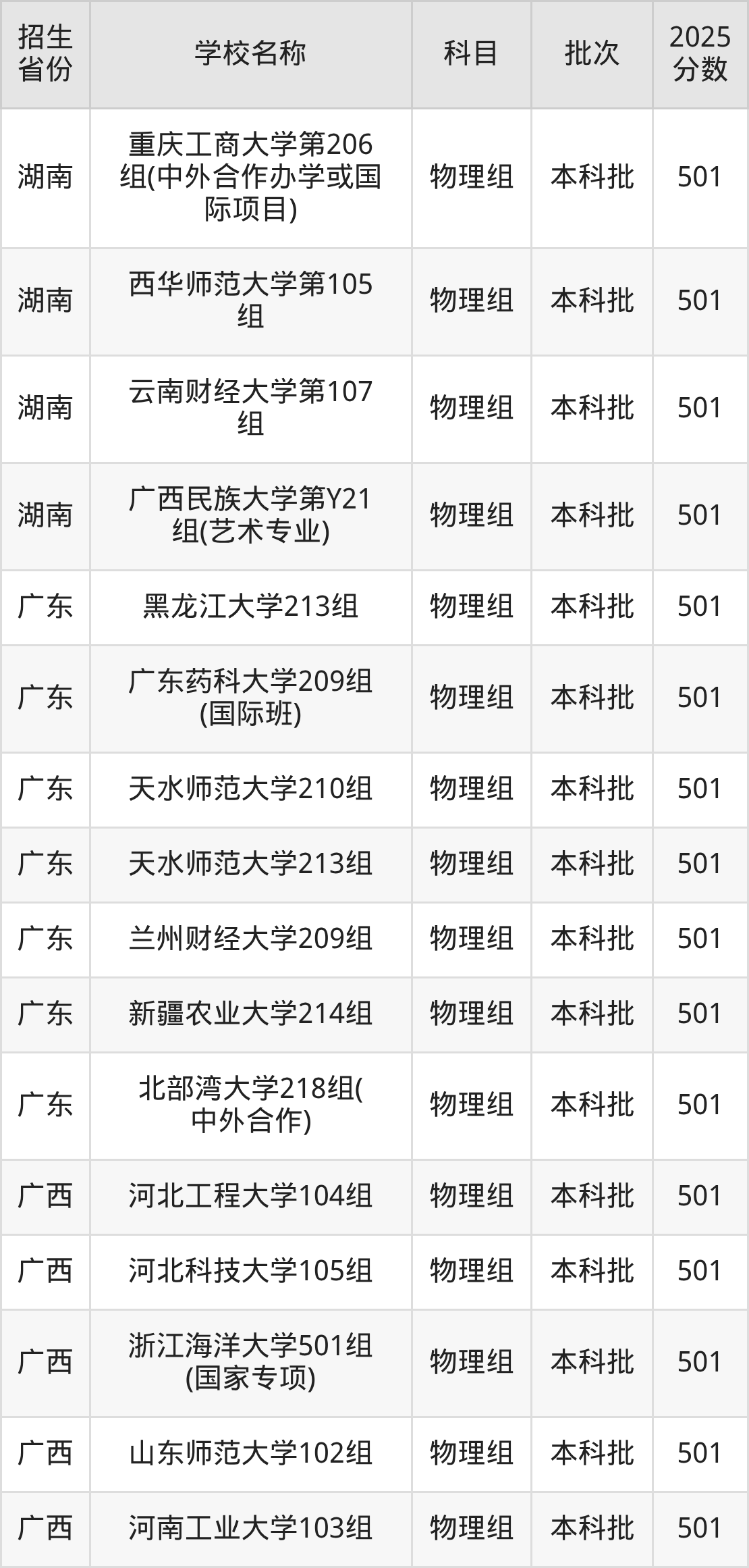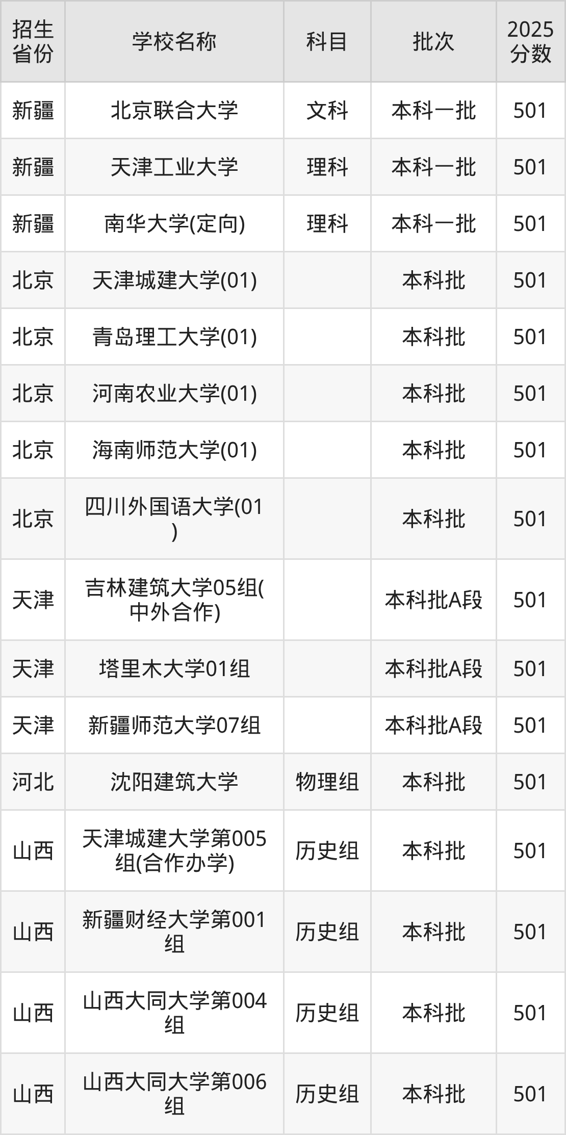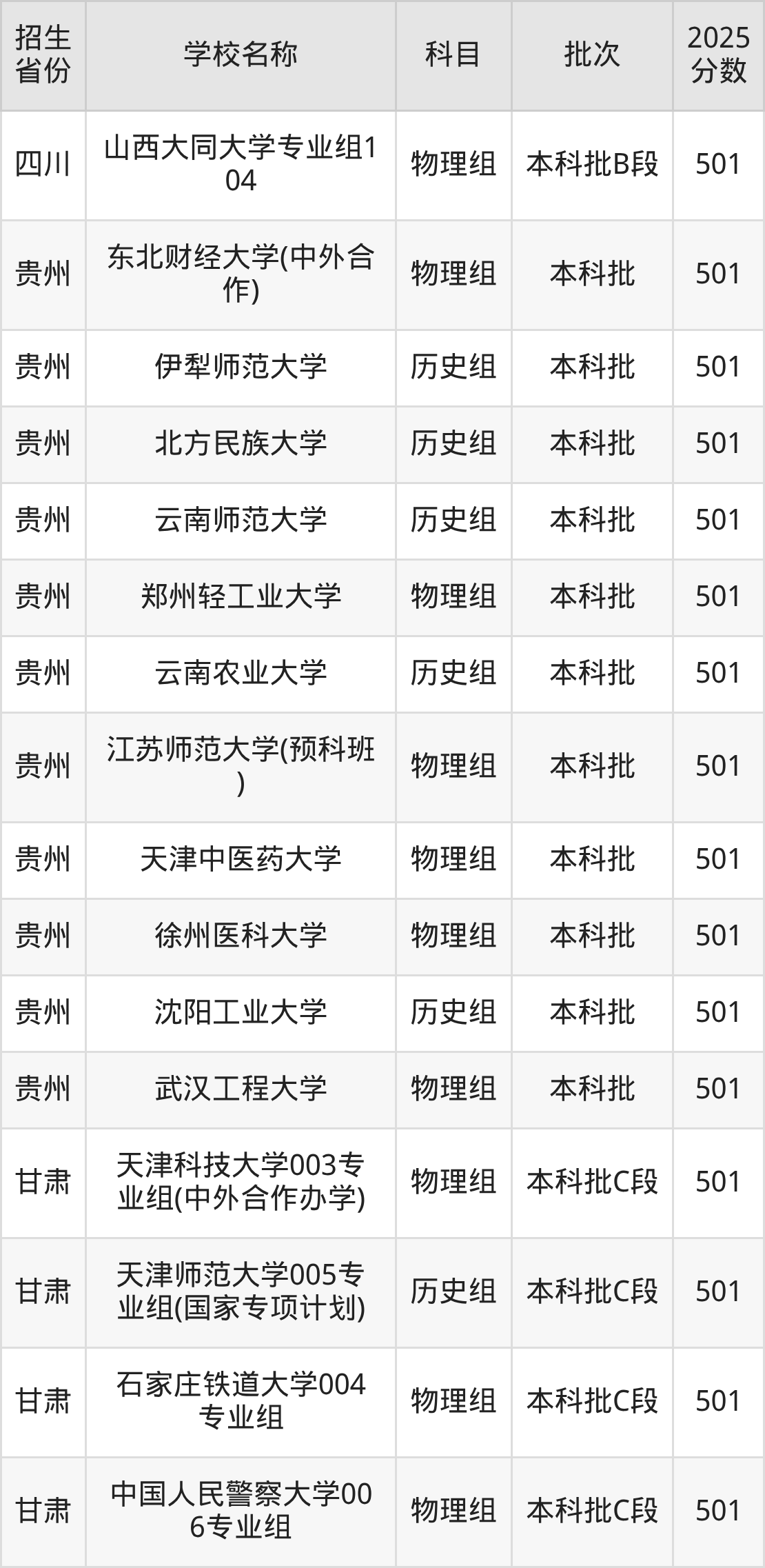 筛选全国各省2025年录取分数线为501分的一本大学如下: