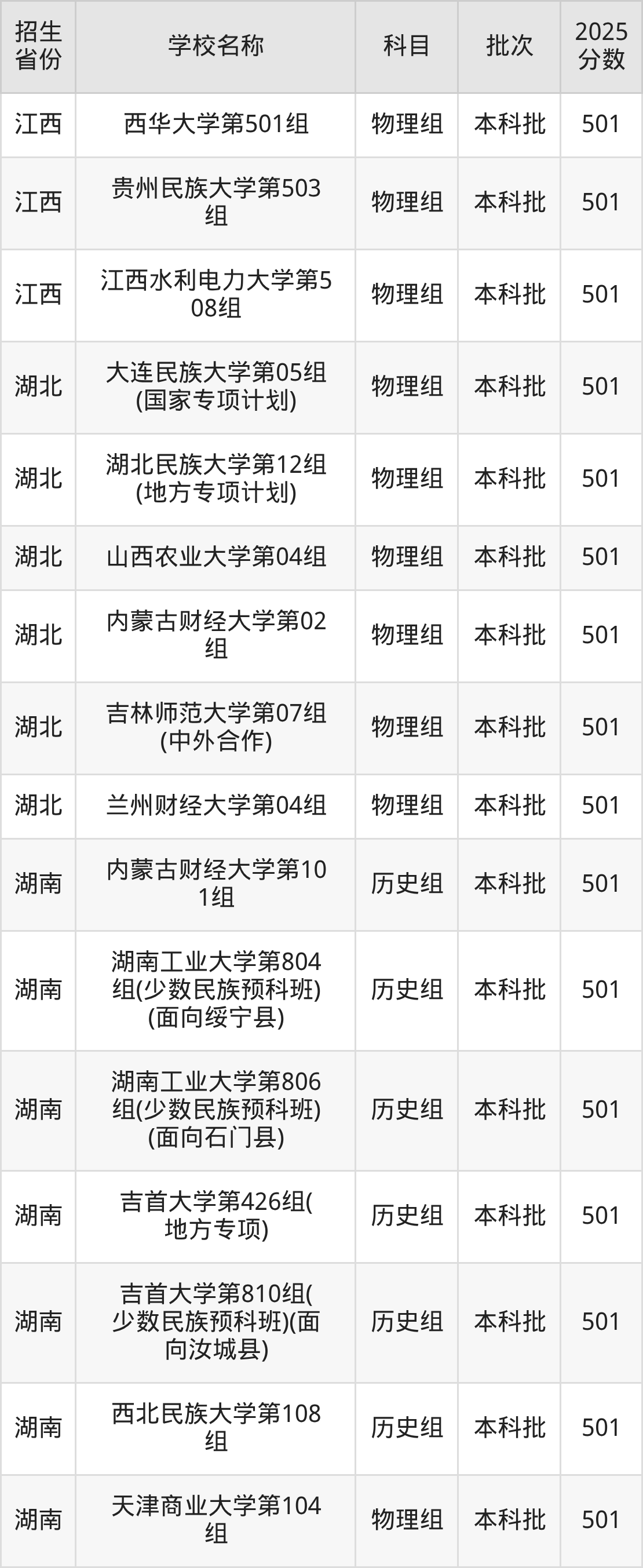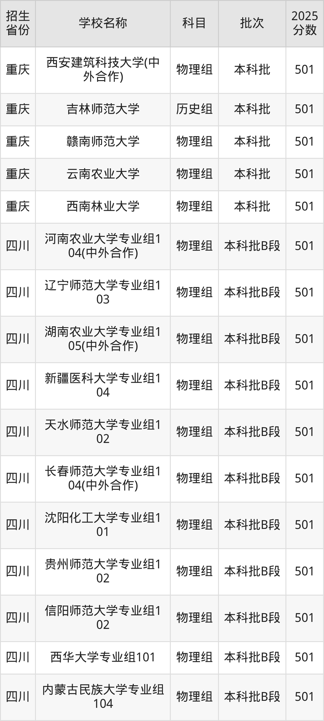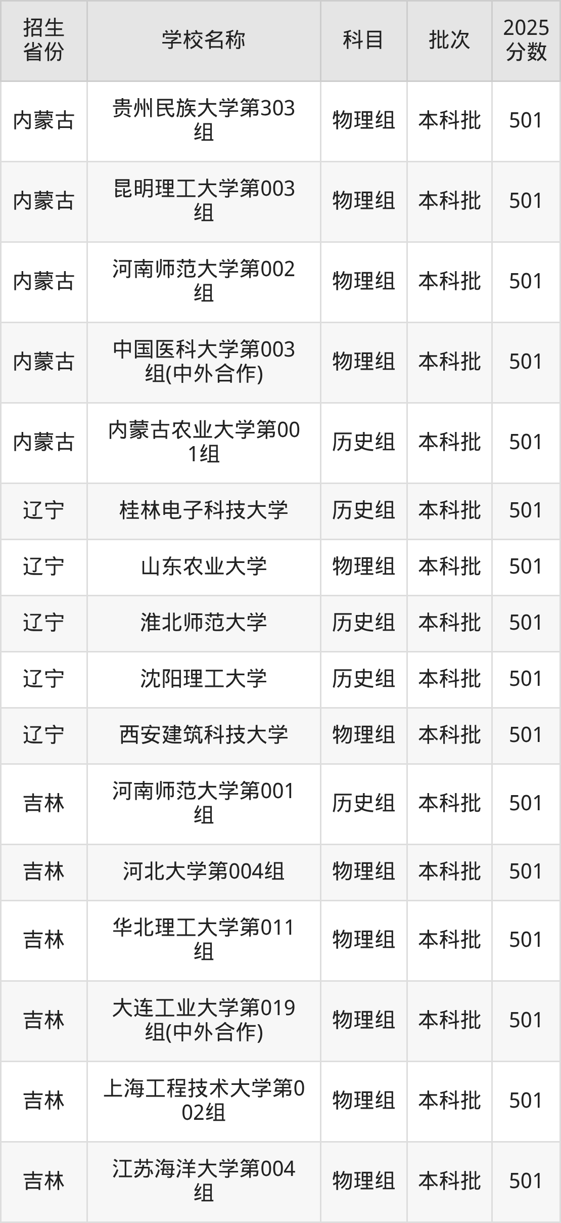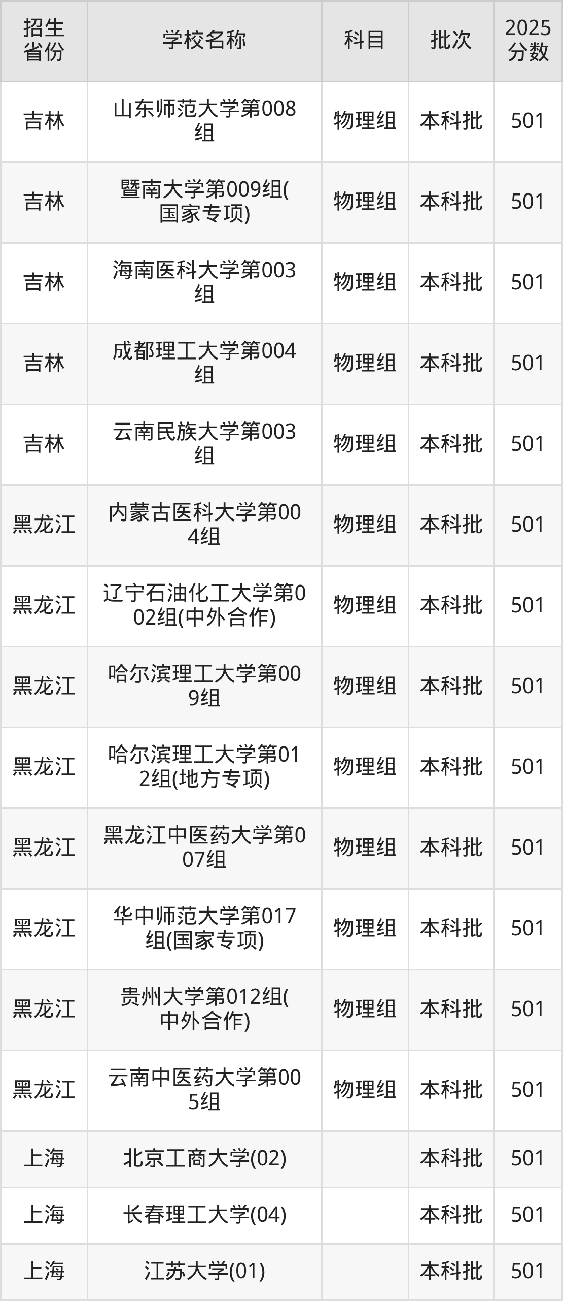 筛选全国各省2025年录取分数线为501分的一本大学如下: