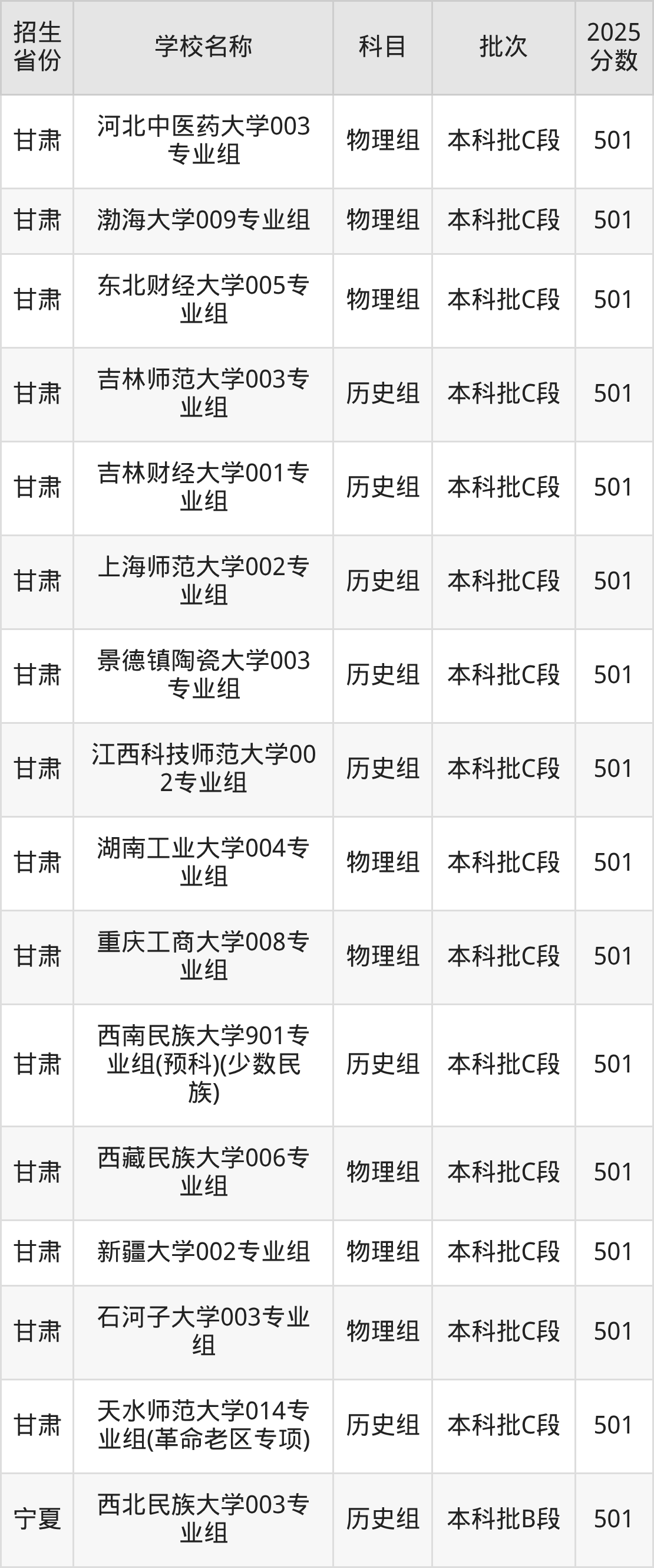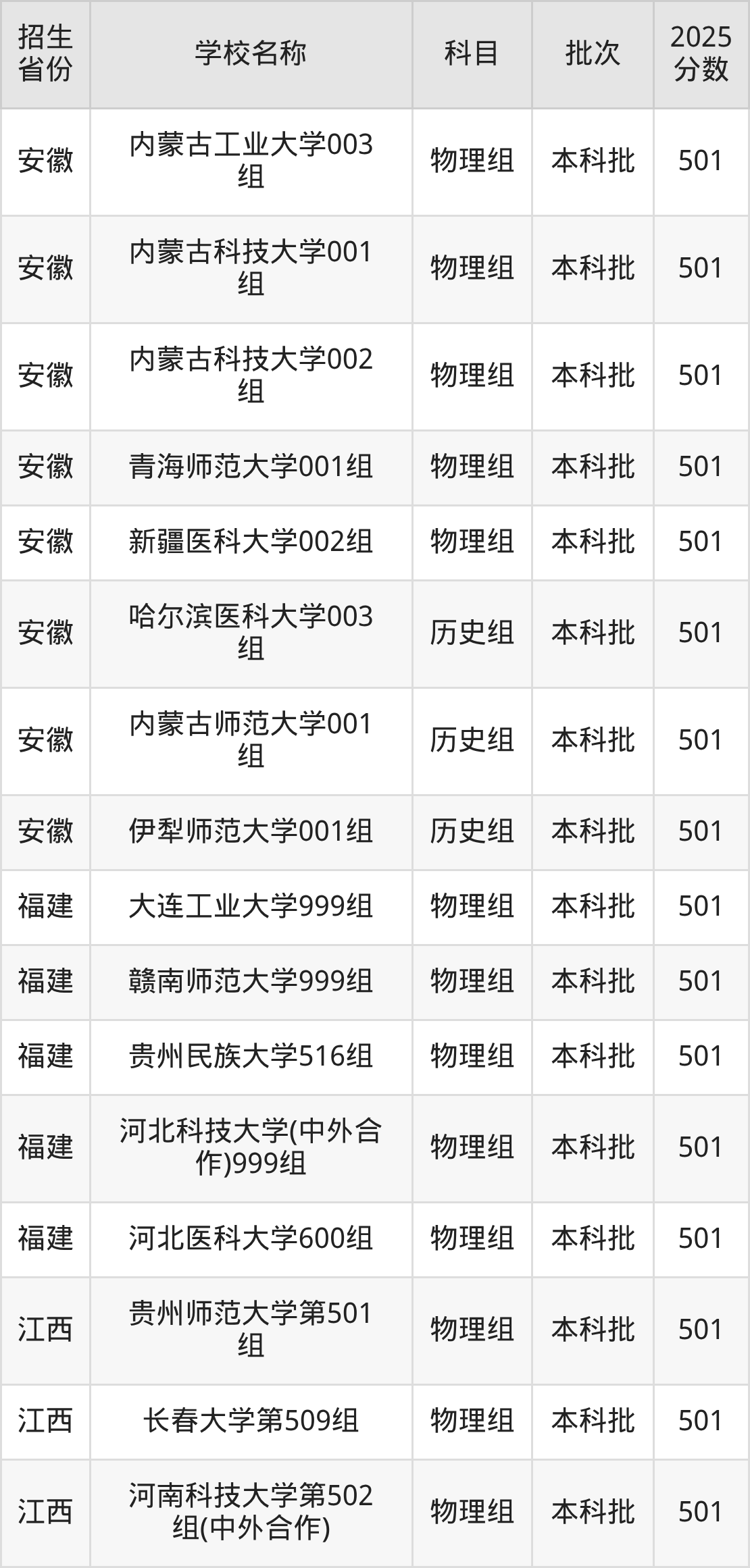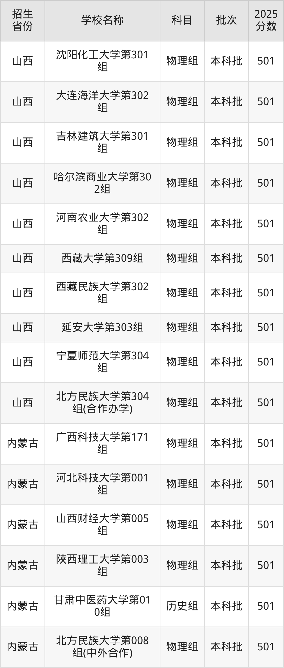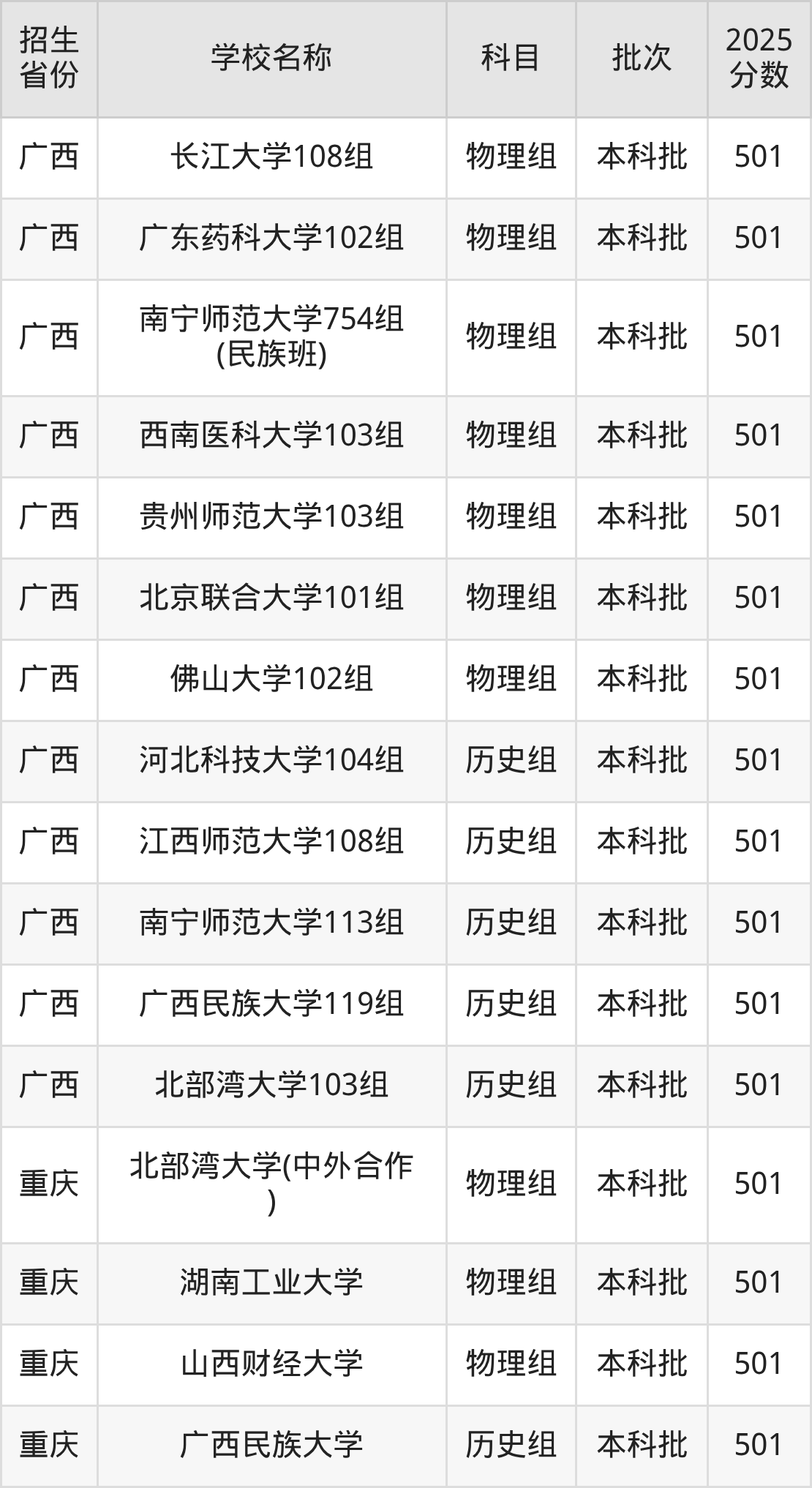 筛选全国各省2025年录取分数线为501分的一本大学如下: