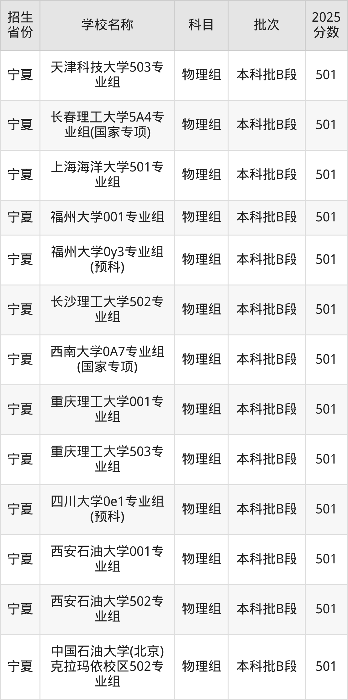 宁夏回族自治区物理组分数线是501分的一本大学有:天津科技大学、长春理工大学、上海海洋大学、福州大学、长沙理工大学、西南大学、重庆理工大学、四川大学、西安石油大学、中国石油大学(北京)克拉玛依校区。