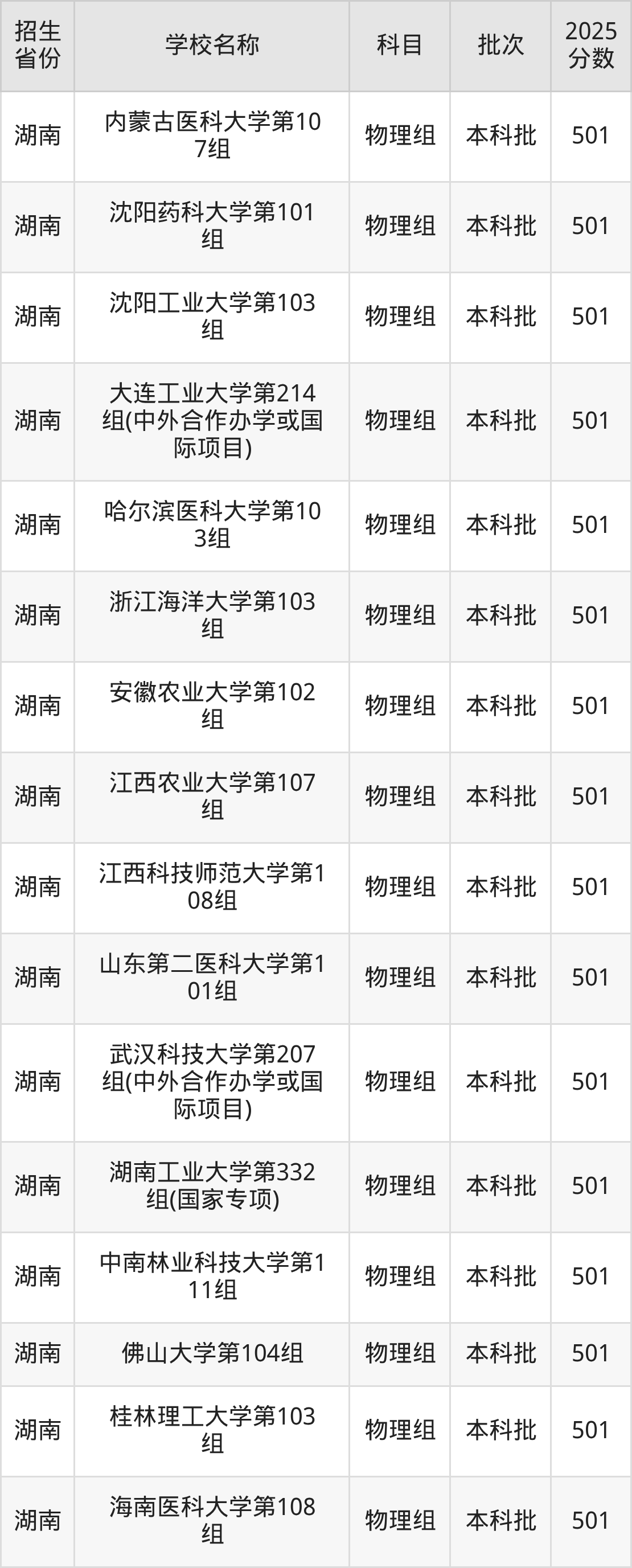 湖南省物理组分数线是501分的一本大学有:天津商业大学、内蒙古医科大学、沈阳药科大学、沈阳工业大学、大连工业大学、哈尔滨医科大学、浙江海洋大学、安徽农业大学、江西农业大学、江西科技师范大学。