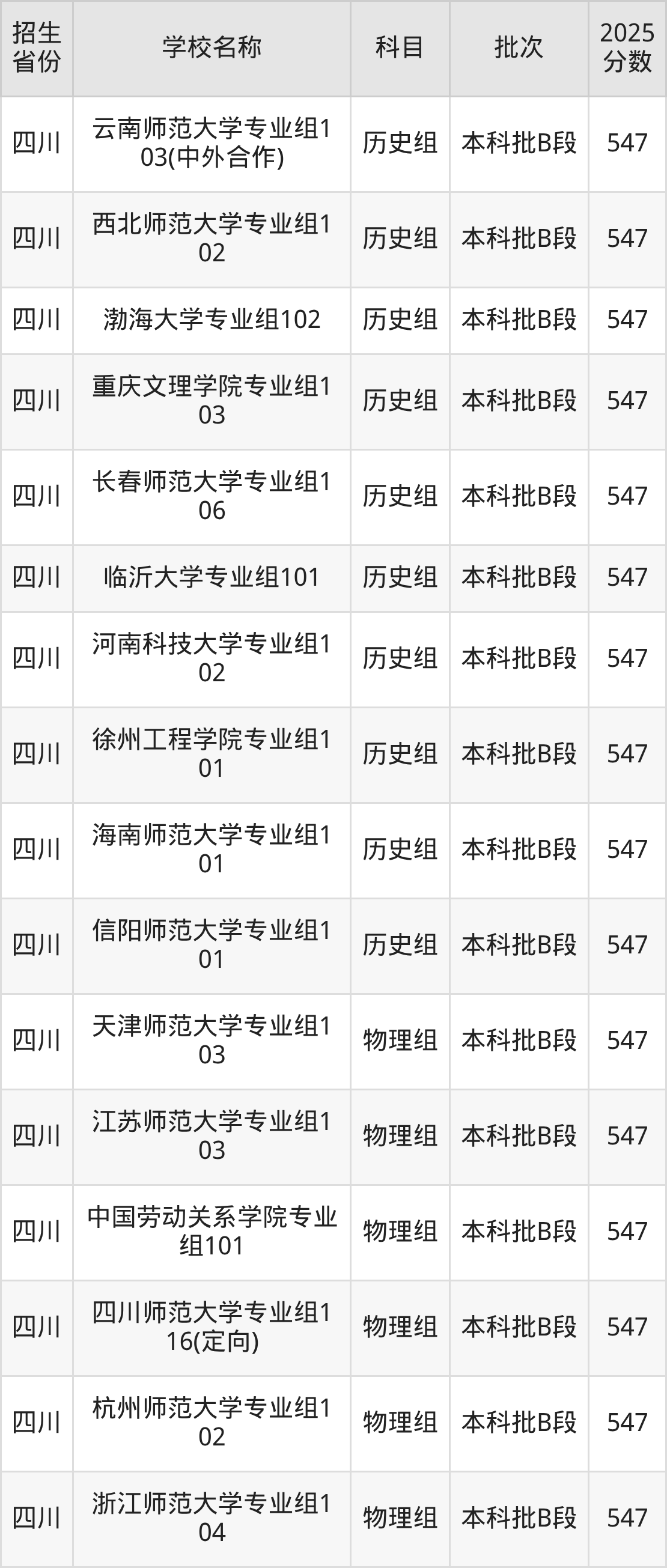 四川省历史组分数线是547分的文科大学有:延安大学、云南师范大学、西北师范大学、渤海大学、重庆文理学院、长春师范大学、临沂大学、河南科技大学、徐州工程学院、海南师范大学。