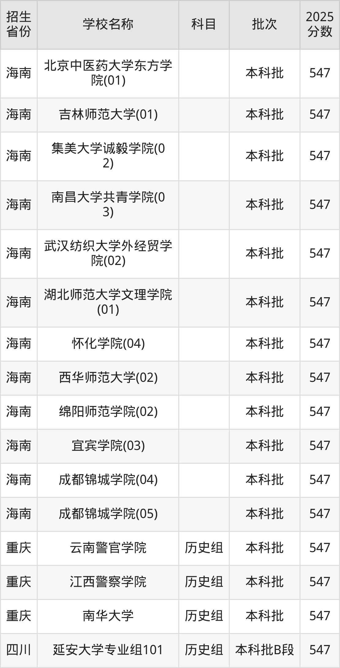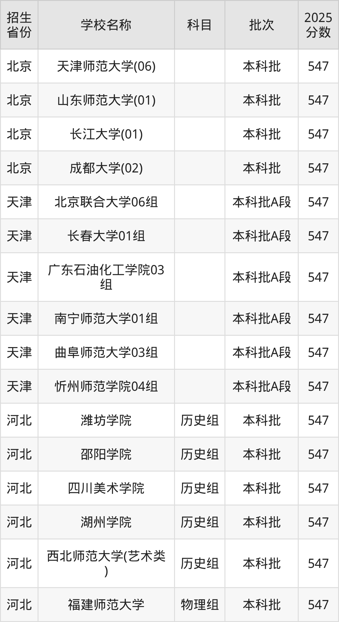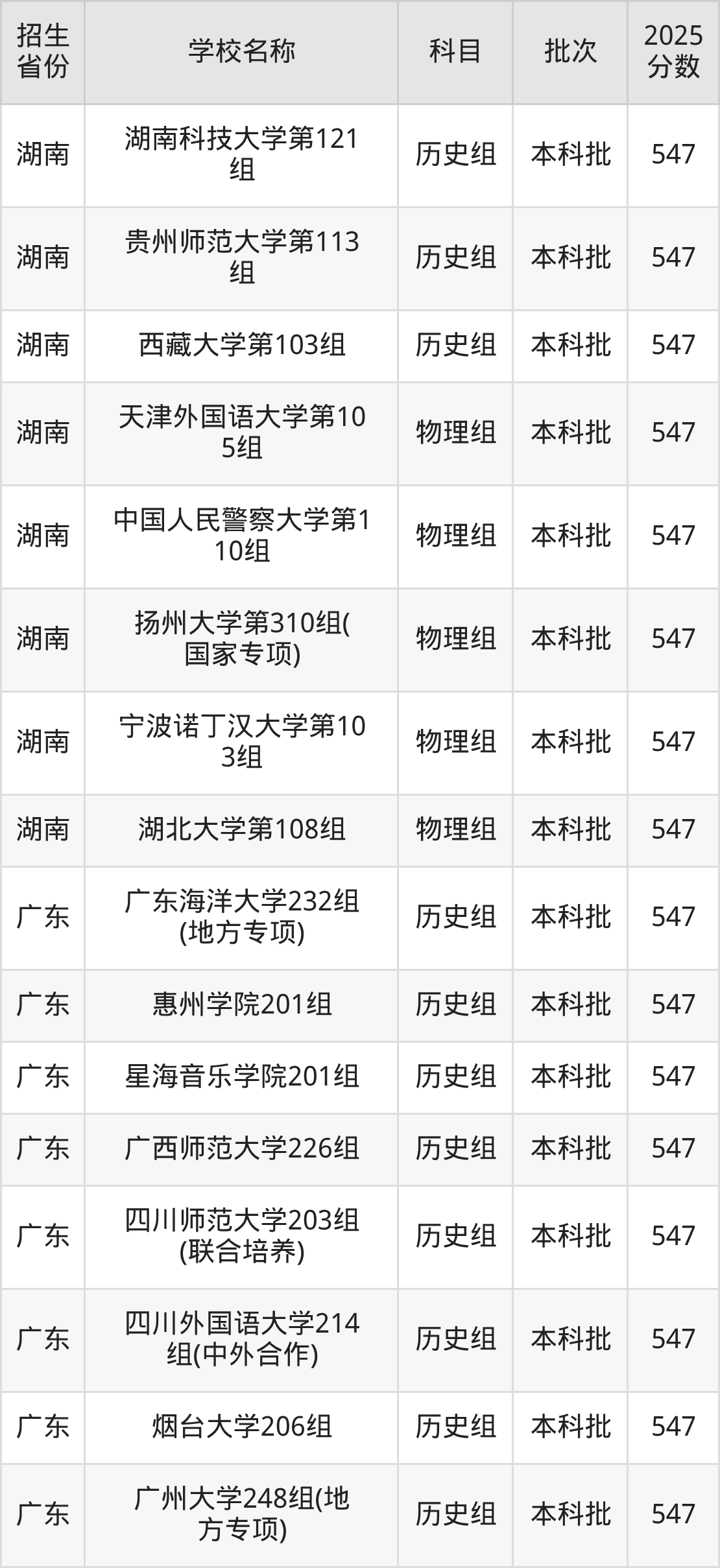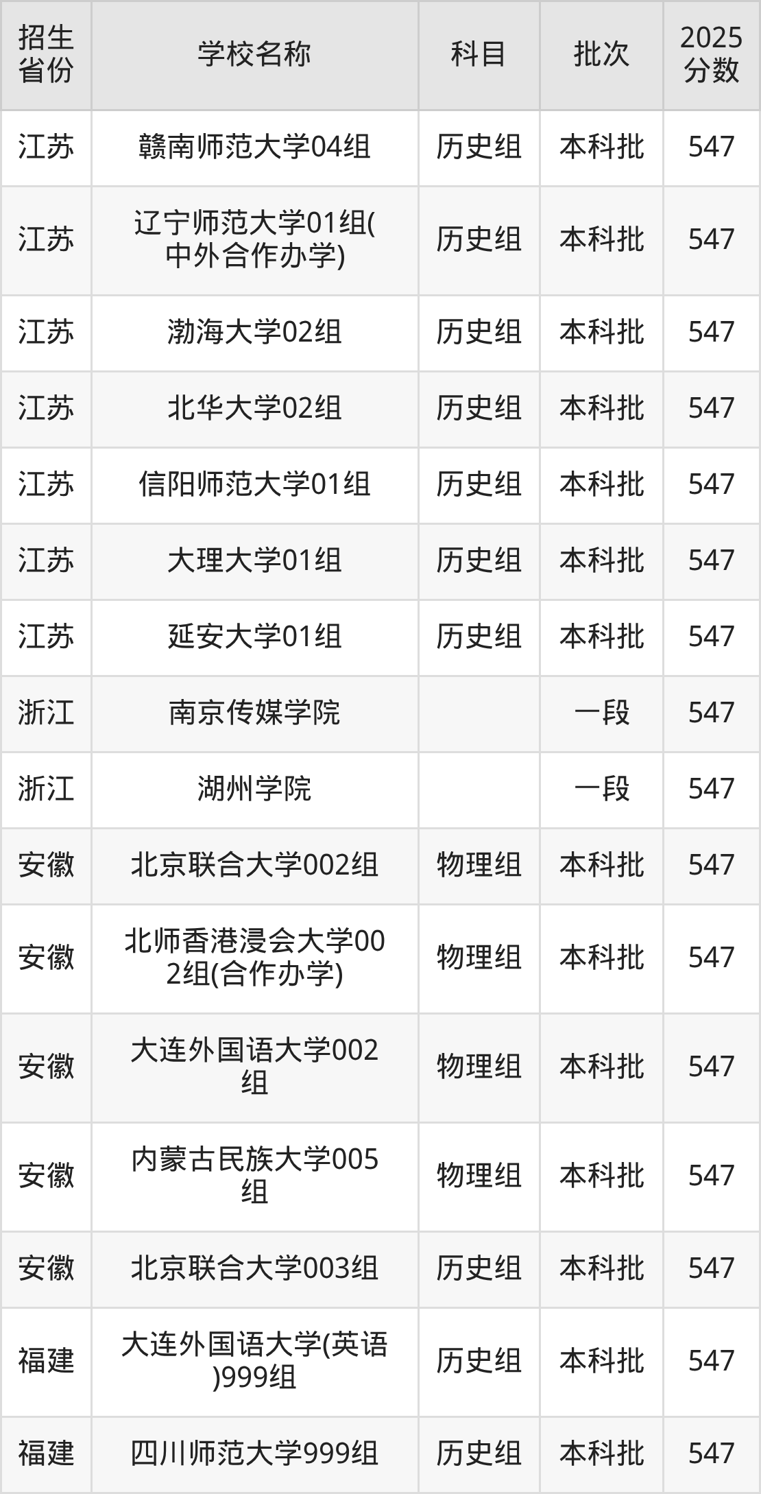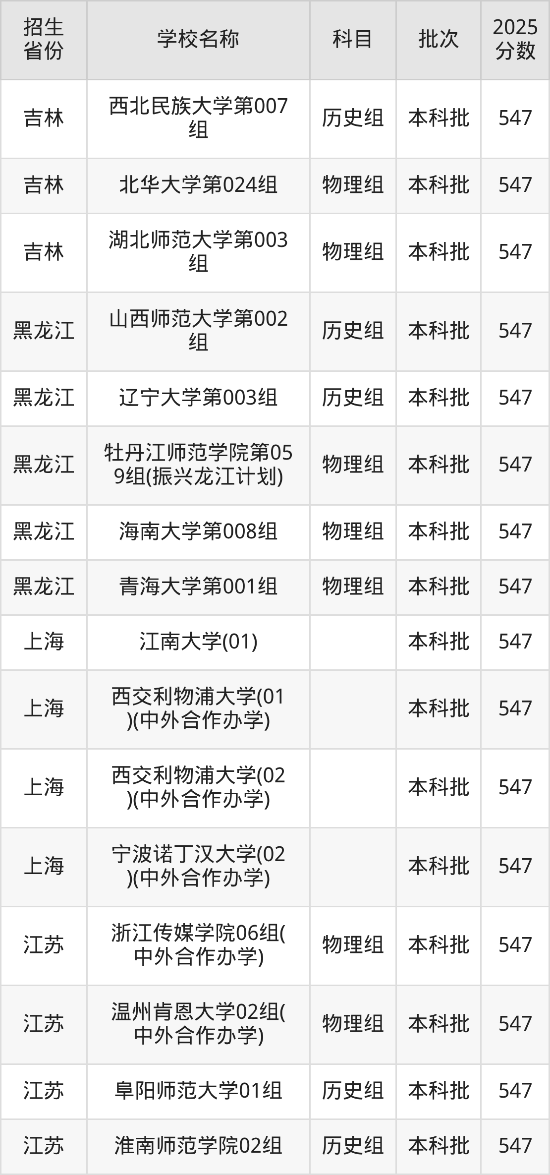筛选全国各省2025年录取分数线为547分的文科大学如下: