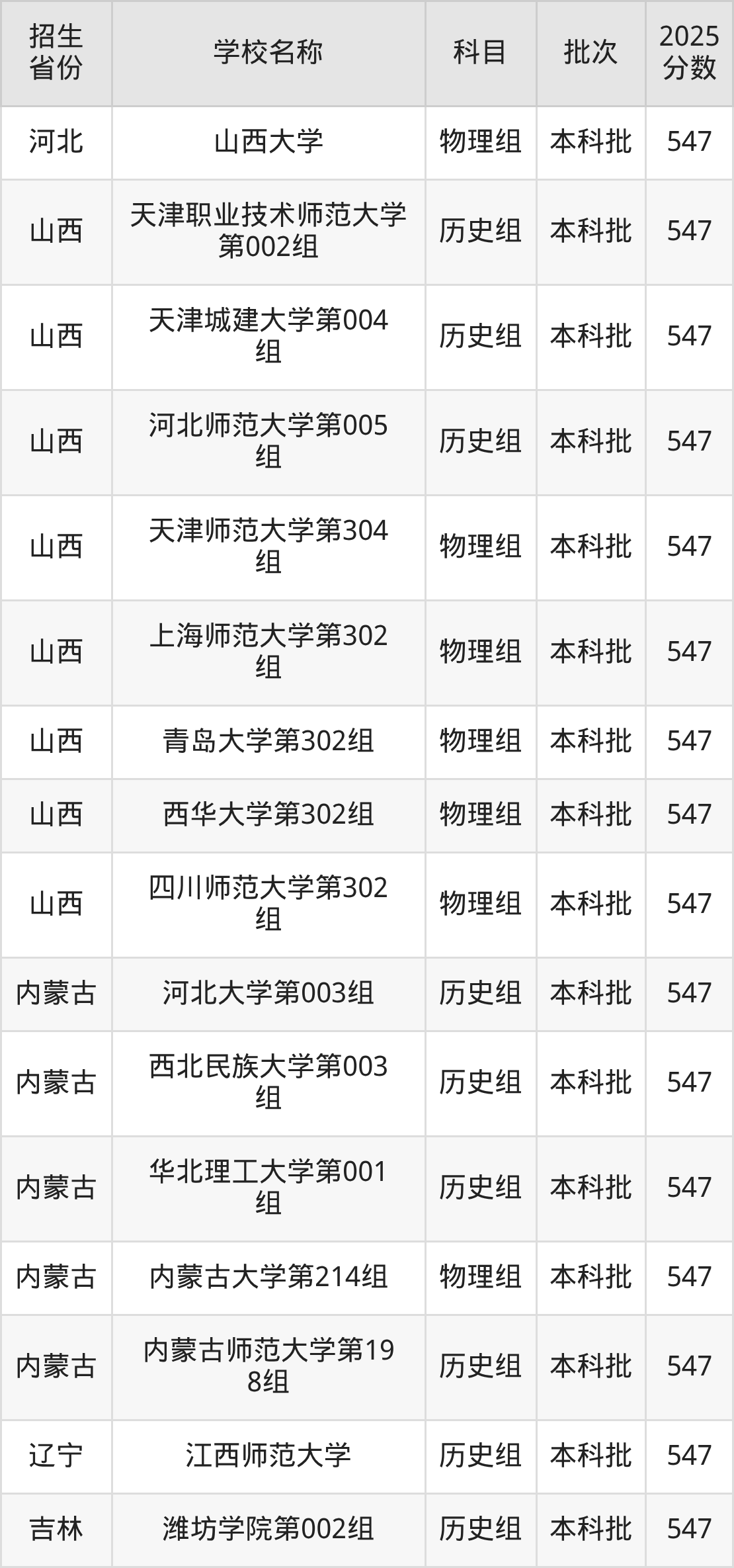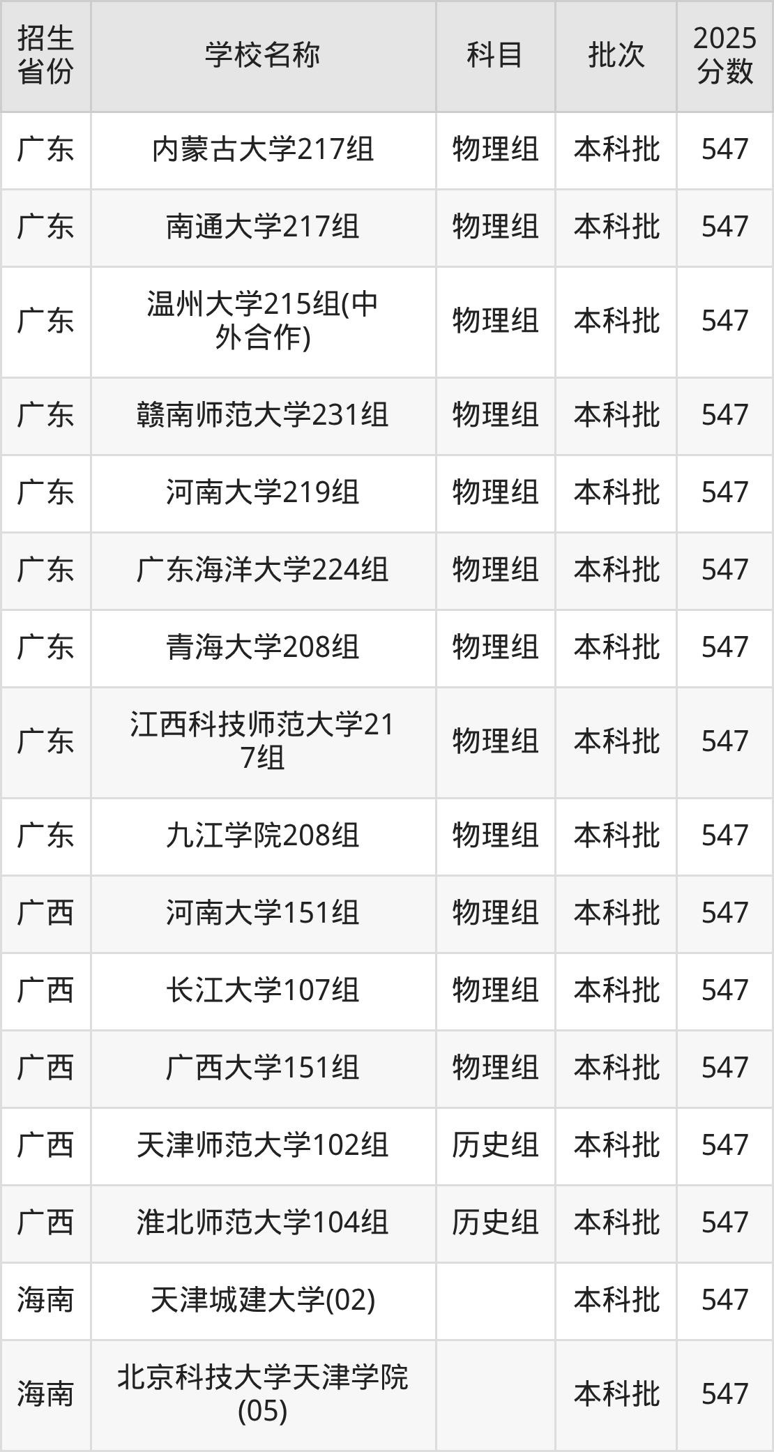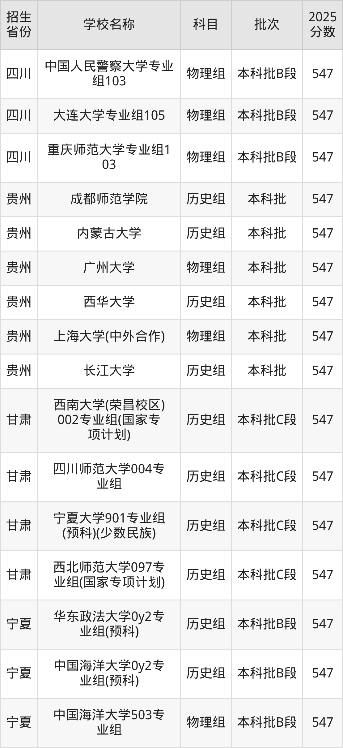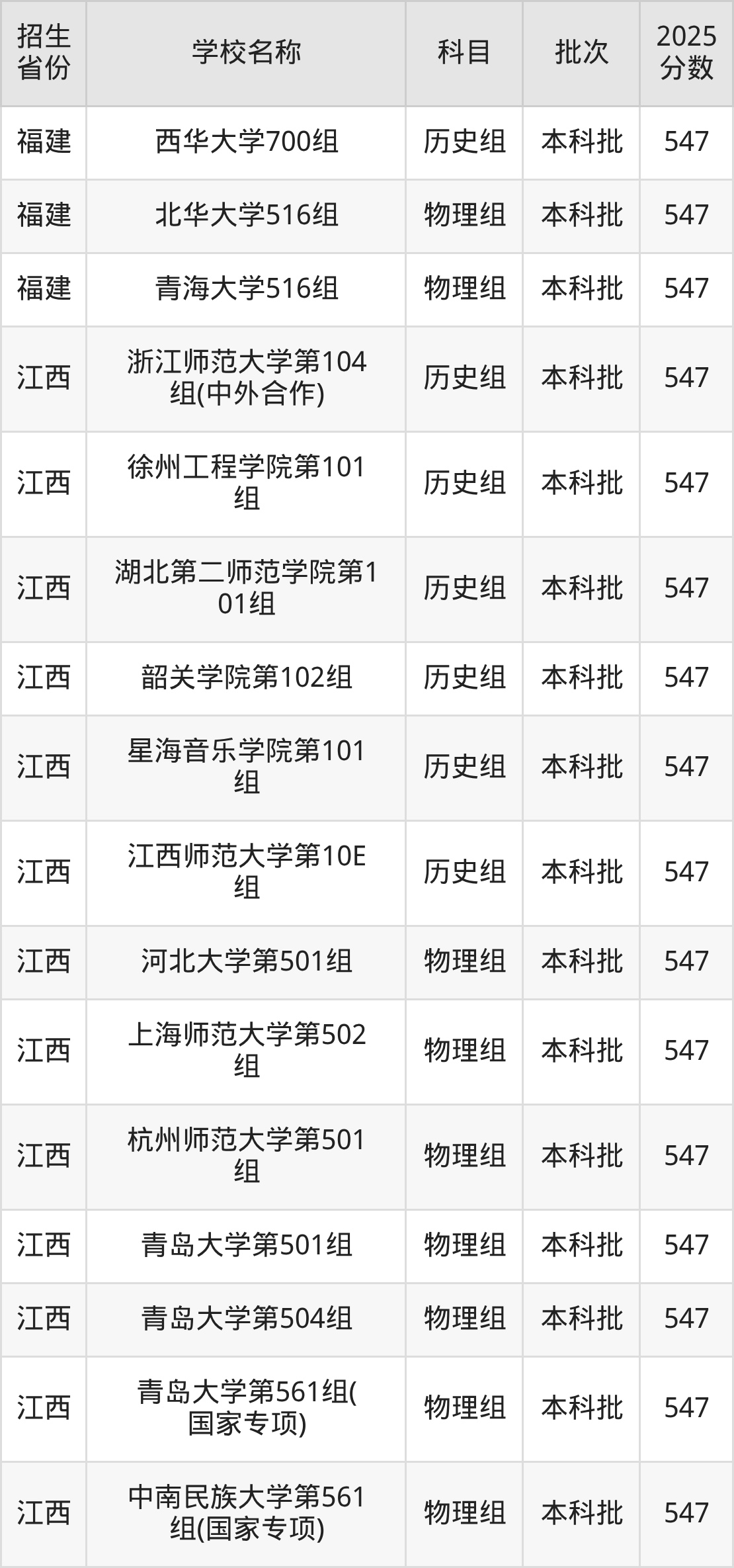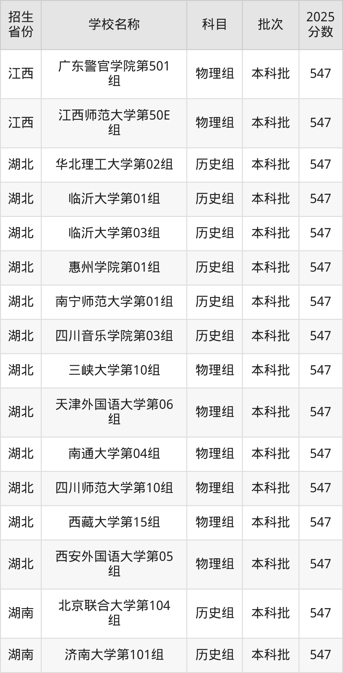筛选全国各省2025年录取分数线为547分的文科大学如下: