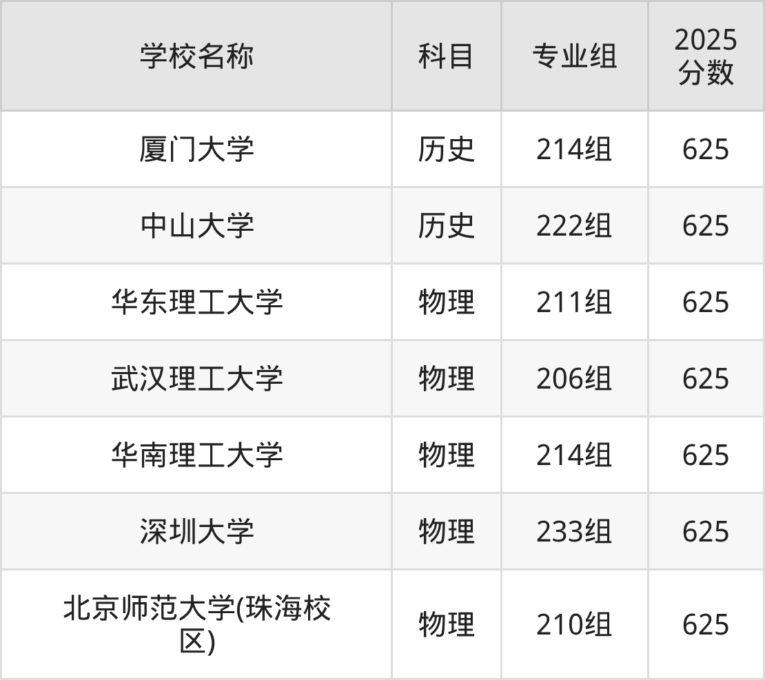 广东高考录取分数线在625分左右的公办院校专业组一共有7个,其中历史组有:厦门大学(625分)、中山大学(625分),物理组有:华东理工大学(625分)、武汉理工大学(625分)、华南理工大学(625分)。
