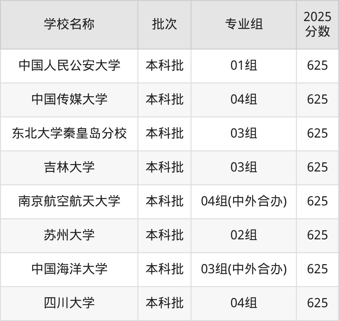 北京高考录取分数线在625分左右的公办大学一共有8所。分别是中国人民公安大学(625分)、中国传媒大学(625分)、东北大学秦皇岛分校(625分)