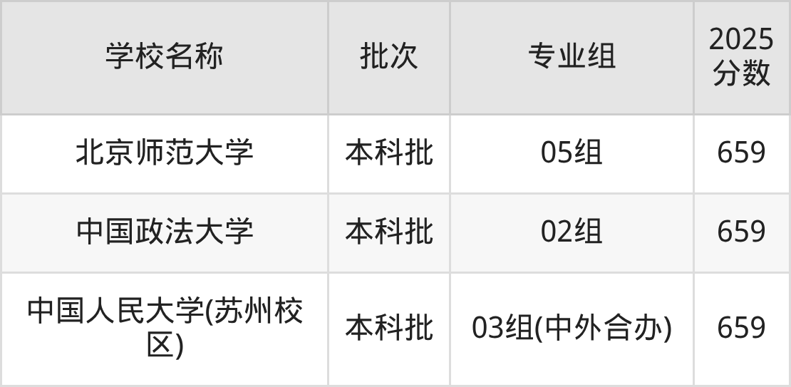 北京高考录取分数线在659分左右的公办大学一共有3所。分别是北京师范大学(659分)、中国政法大学(659分)、中国人民大学(苏州校区)(659分)