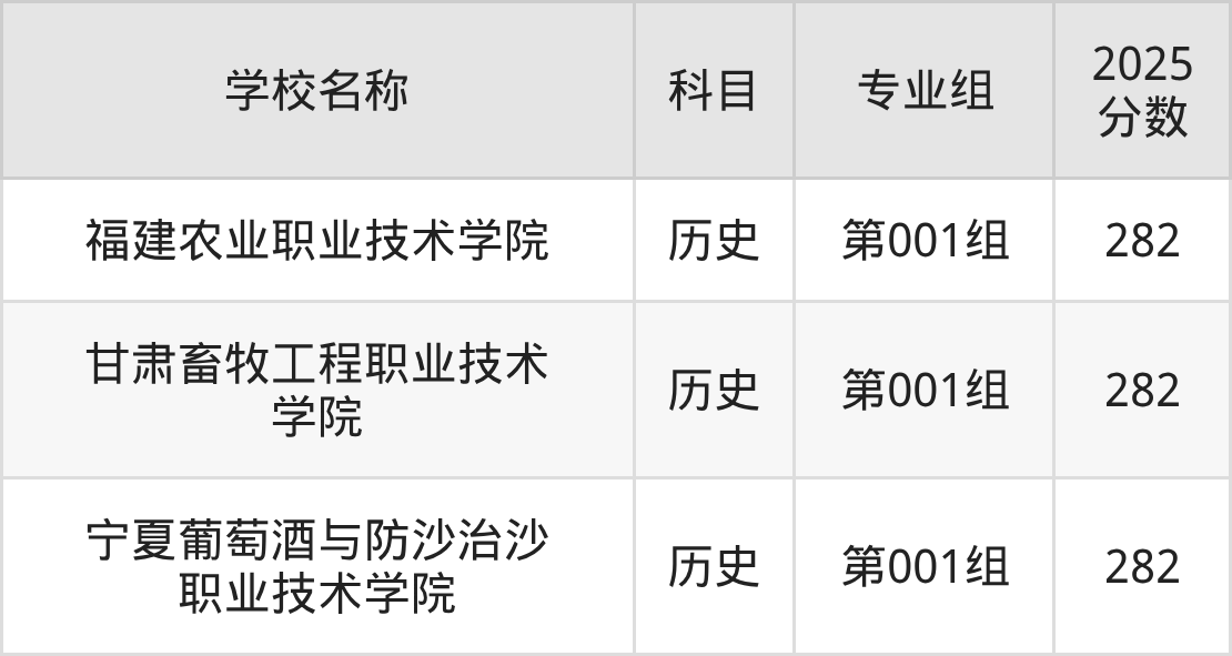 山西高考录取分数线在282分左右的公办院校专业组一共有3个,其中历史组有:福建农业职业技术学院(282分)、甘肃畜牧工程职业技术学院(282分)、宁夏葡萄酒与防沙治沙职业技术学院(282分)。