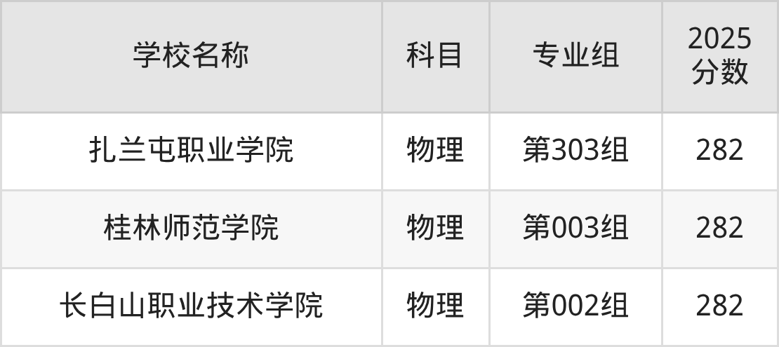 内蒙古高考录取分数线在282分左右的公办院校专业组一共有3个,其中物理组有:扎兰屯职业学院(282分)、桂林师范学院(282分)、长白山职业技术学院(282分)。