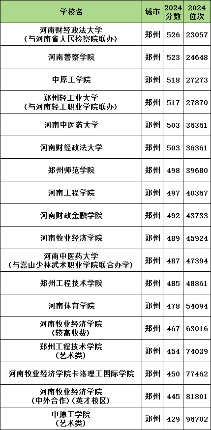 2024年郑州文科公办二本大学录取分数线从429分到526分之间,对应最低排位从23057名到96702名。