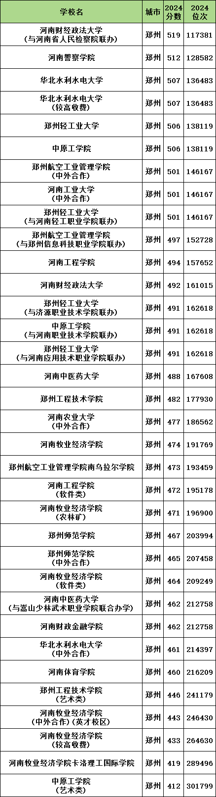 2024年郑州理科公办二本大学录取分数线从412分到519分之间,对应最低排位从117381名到301799名。