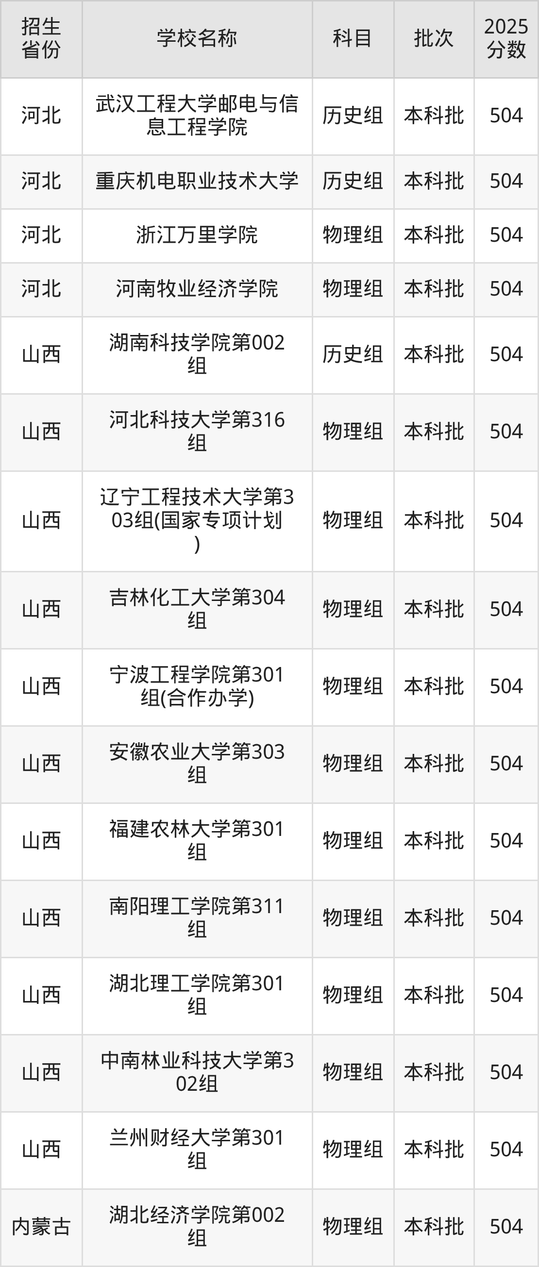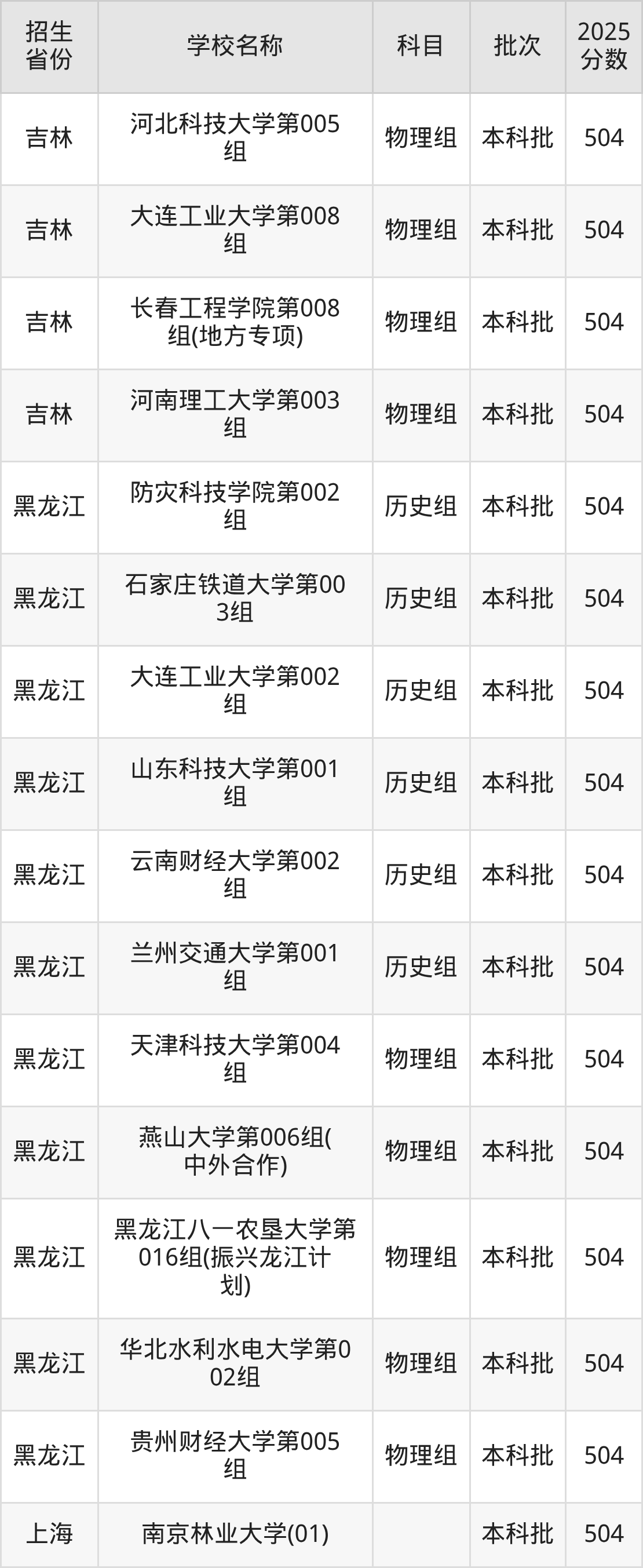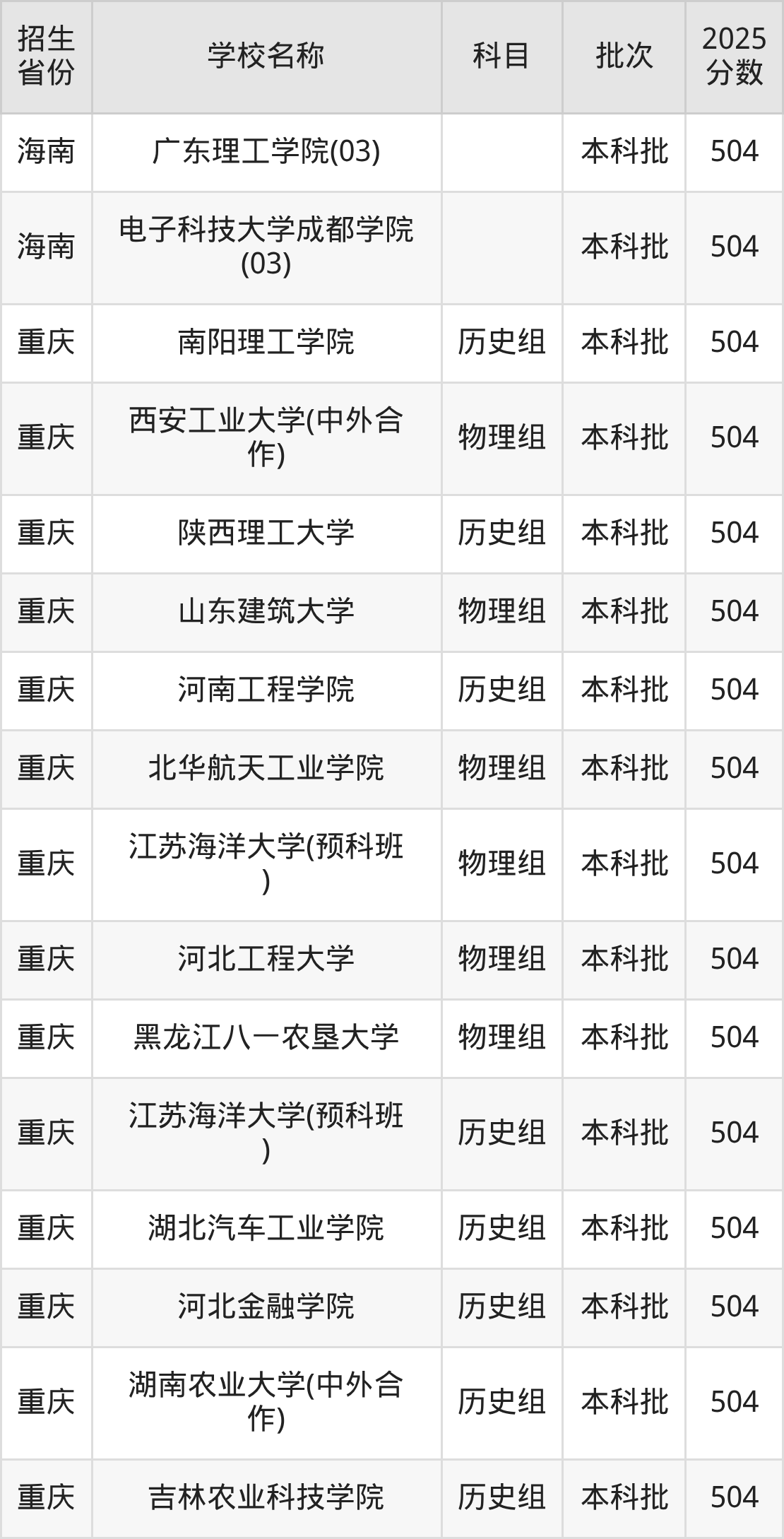 筛选全国各省2025年录取分数线为504分的理科大学如下: