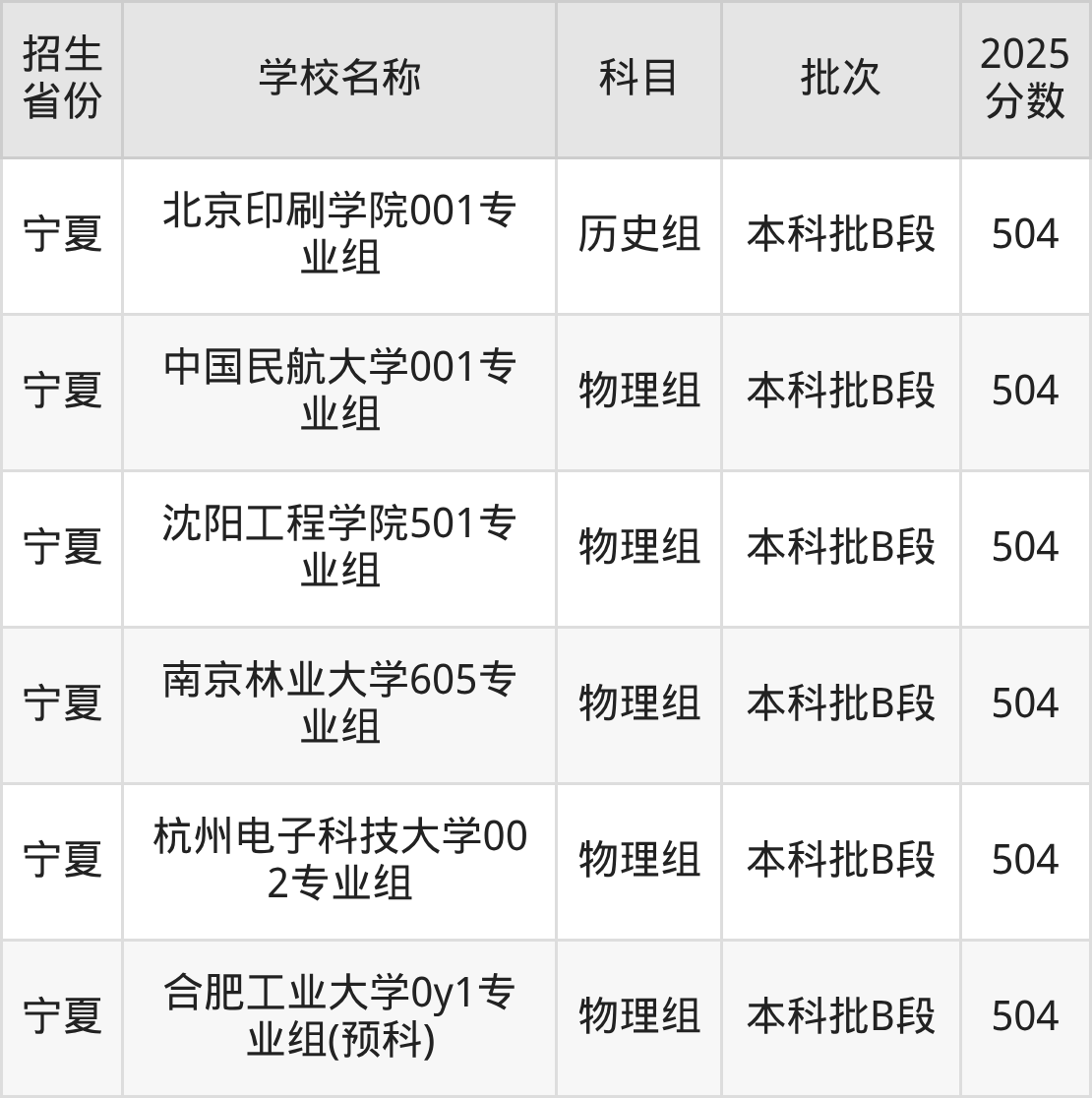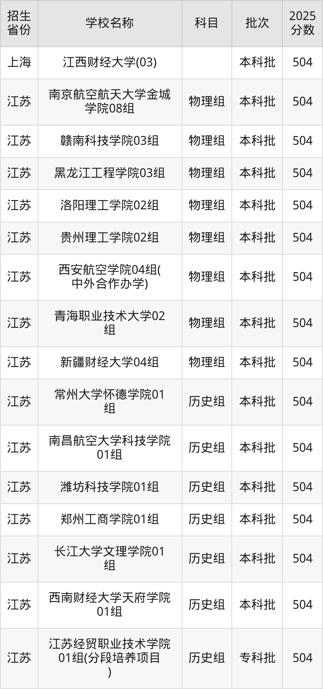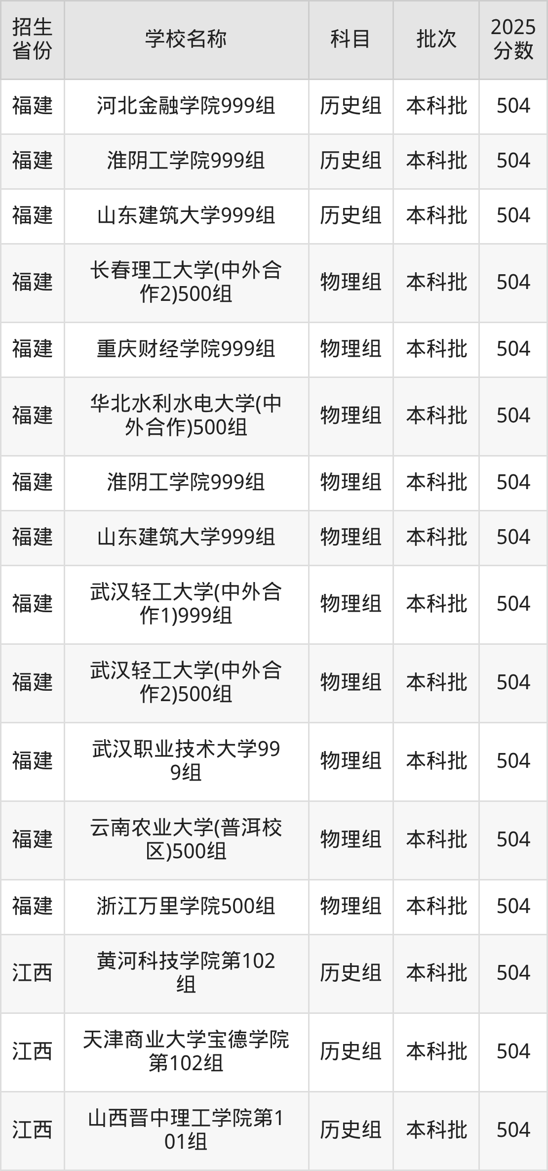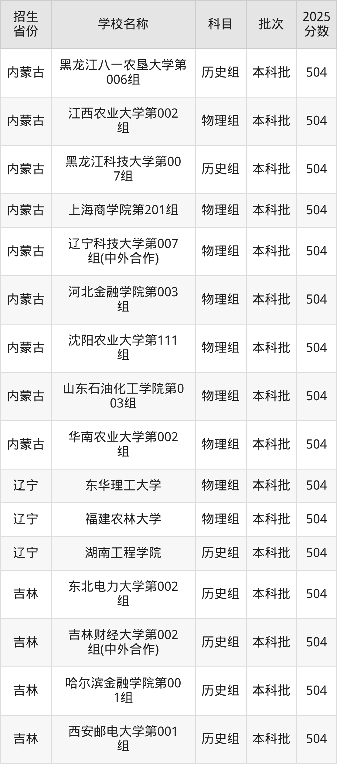 筛选全国各省2025年录取分数线为504分的理科大学如下: