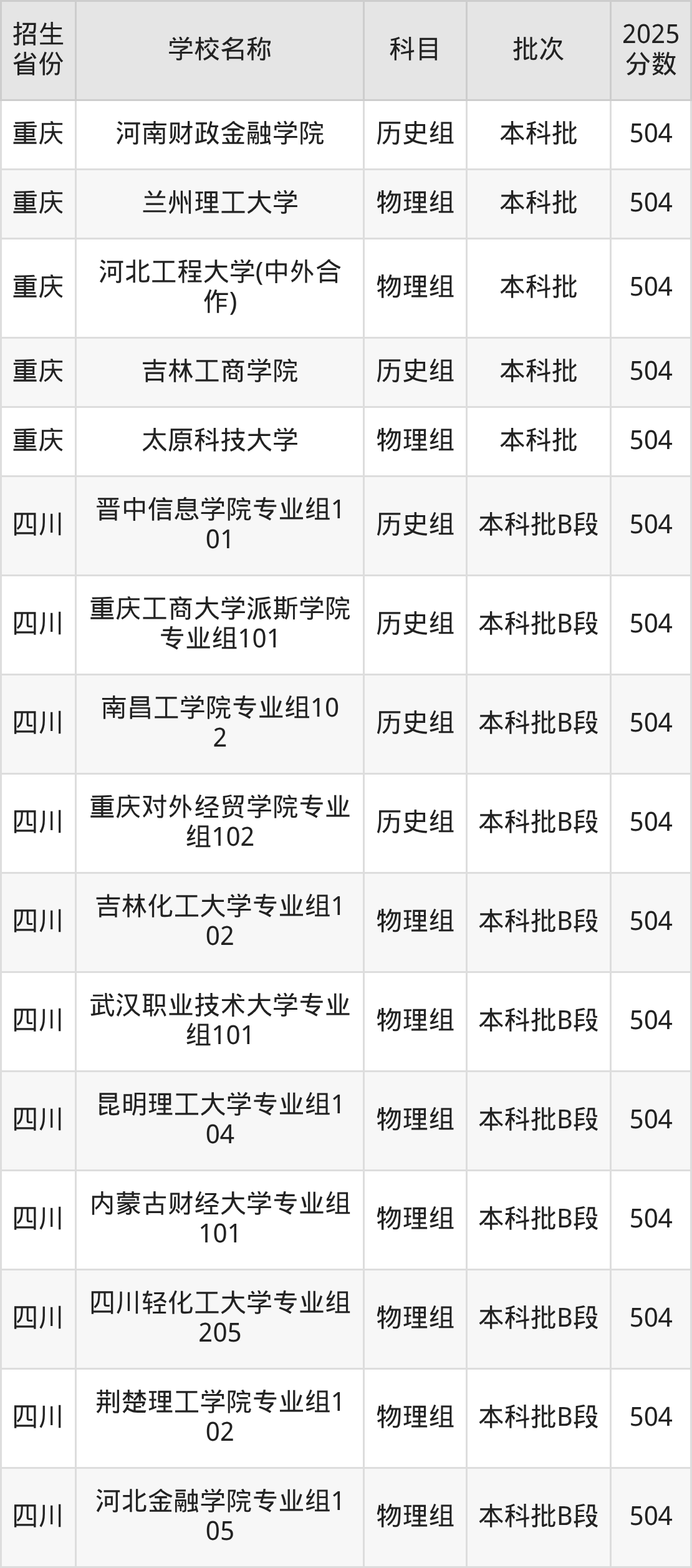 四川省历史组分数线是504分的理科大学有:晋中信息学院、重庆工商大学派斯学院、南昌工学院、重庆对外经贸学院。