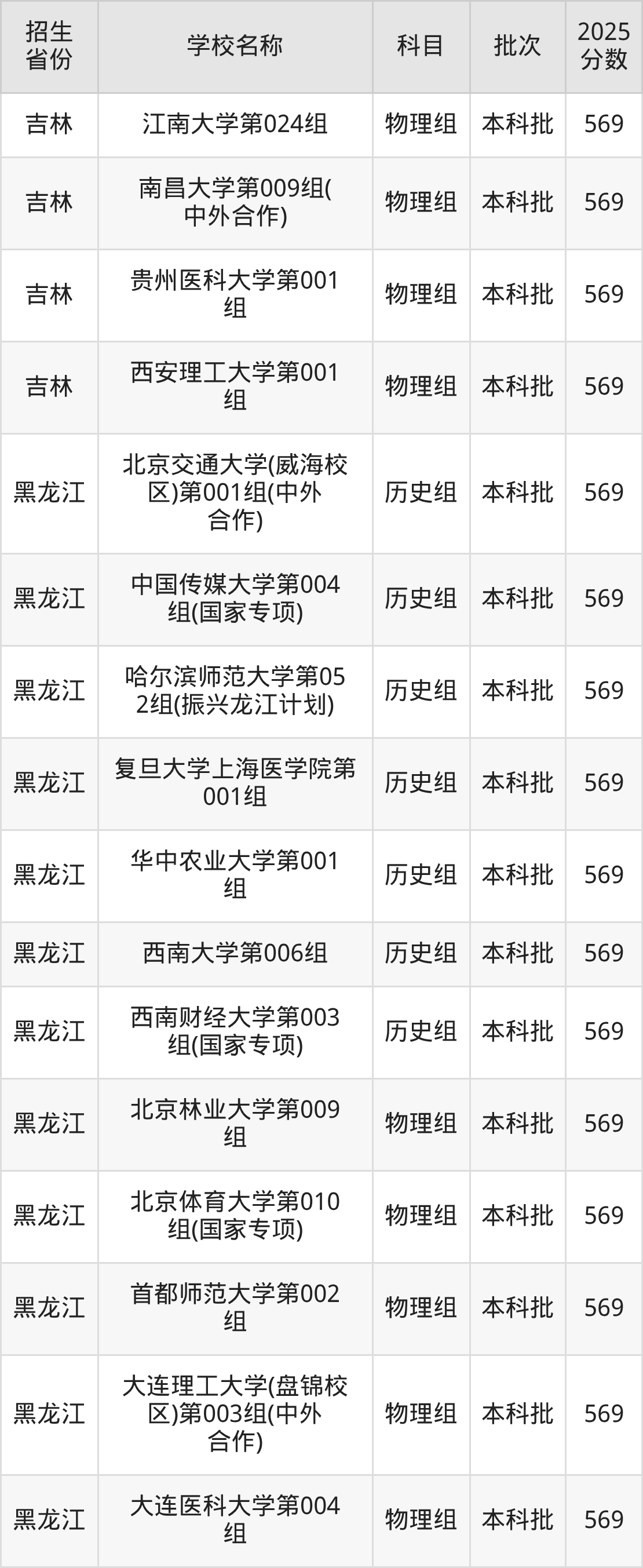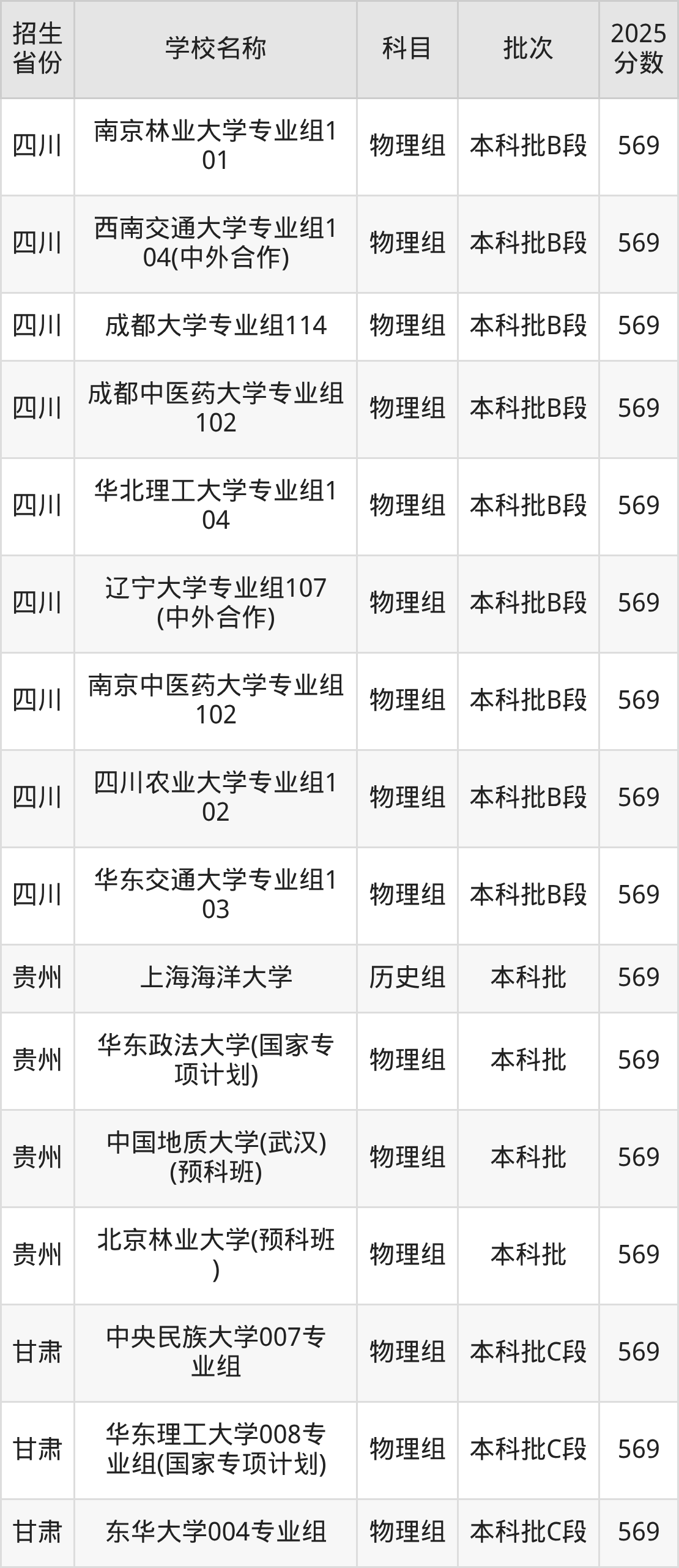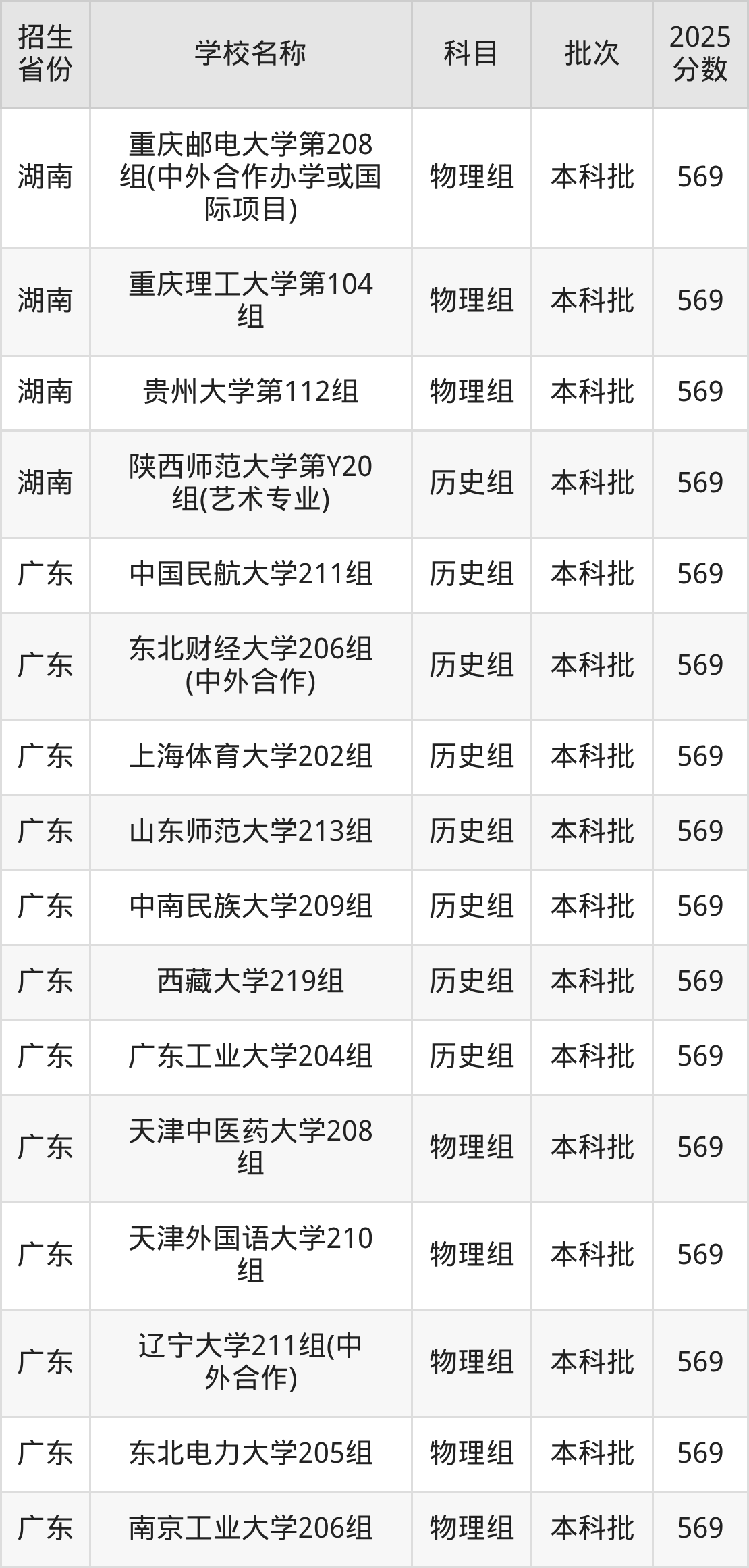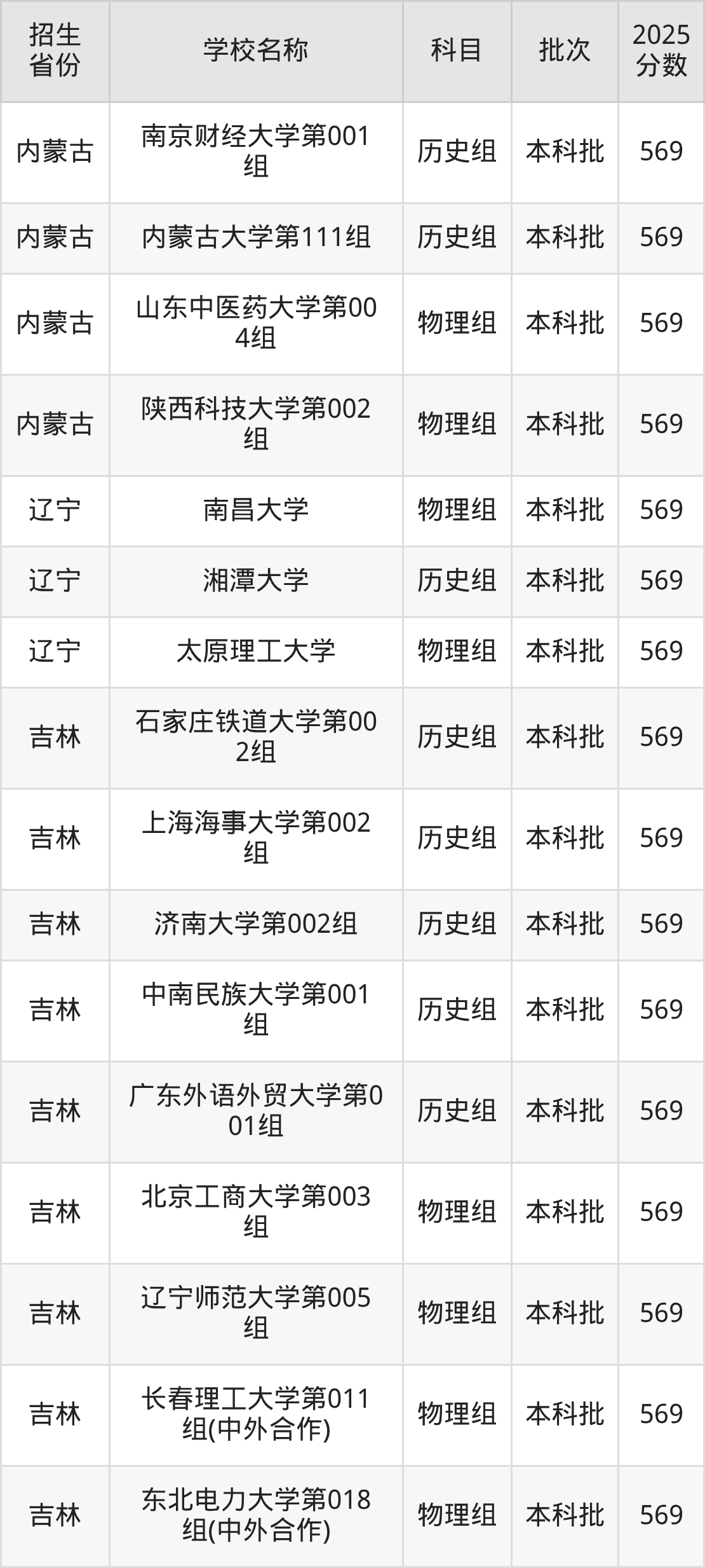 筛选全国各省2025年录取分数线为569分的重点大学如下: