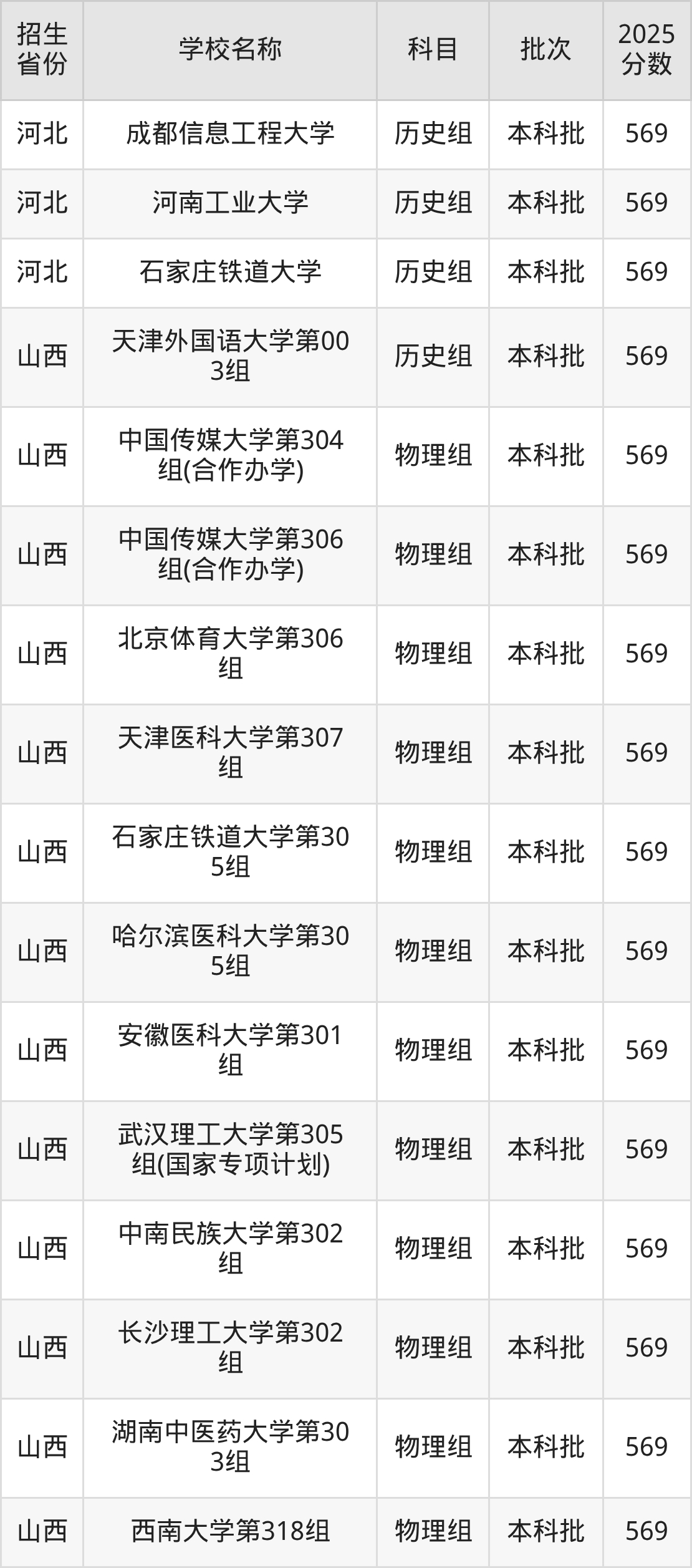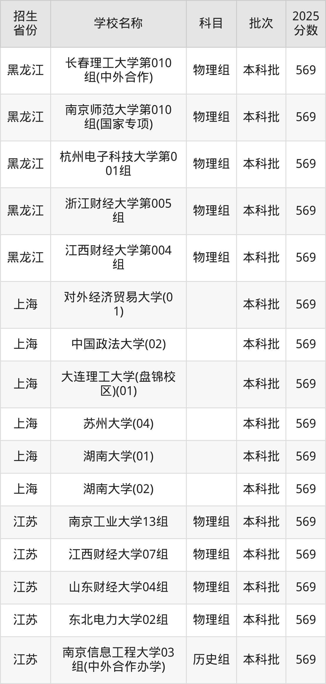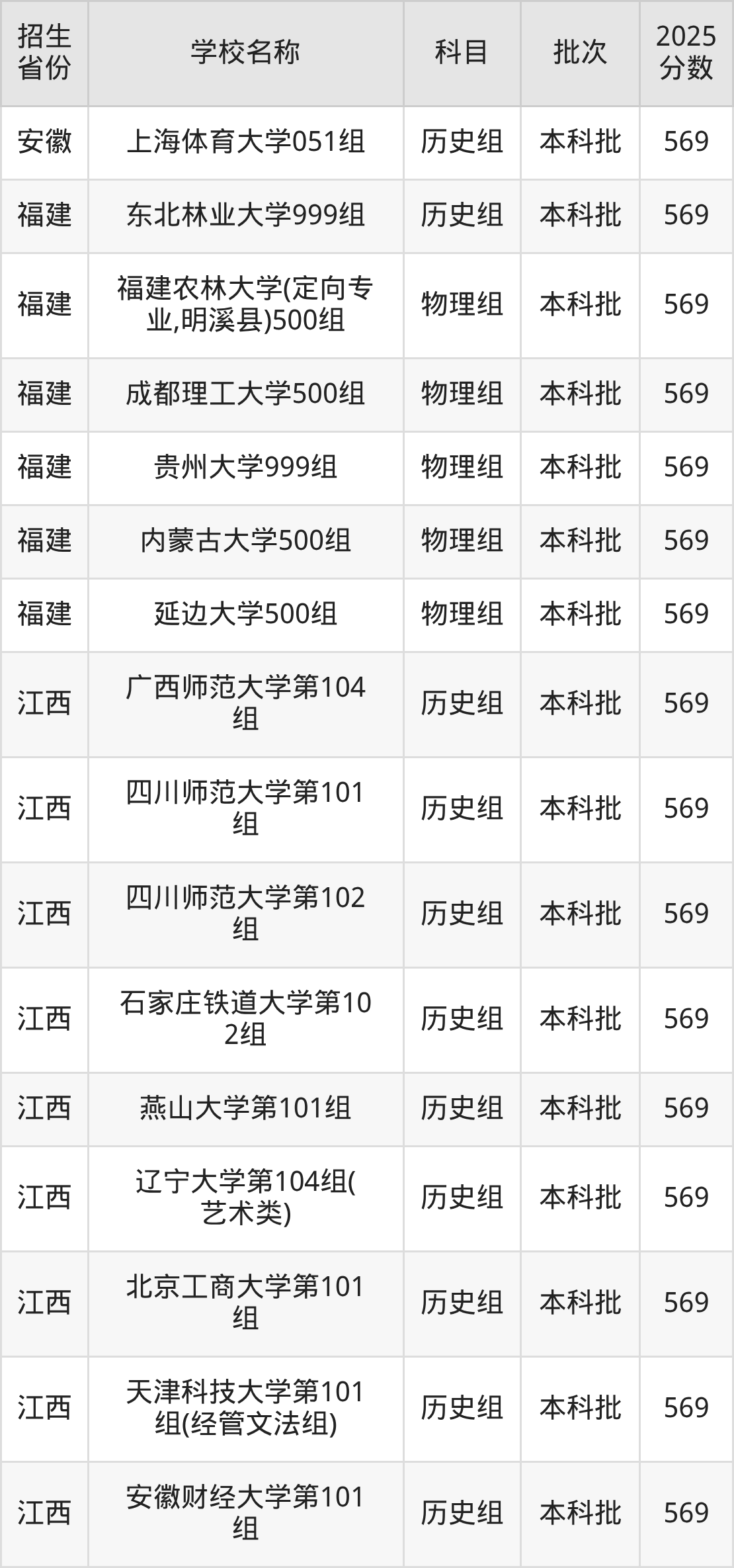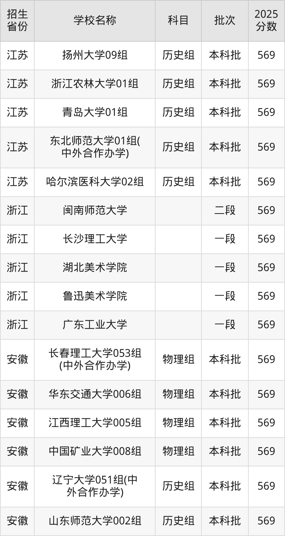 筛选全国各省2025年录取分数线为569分的重点大学如下: