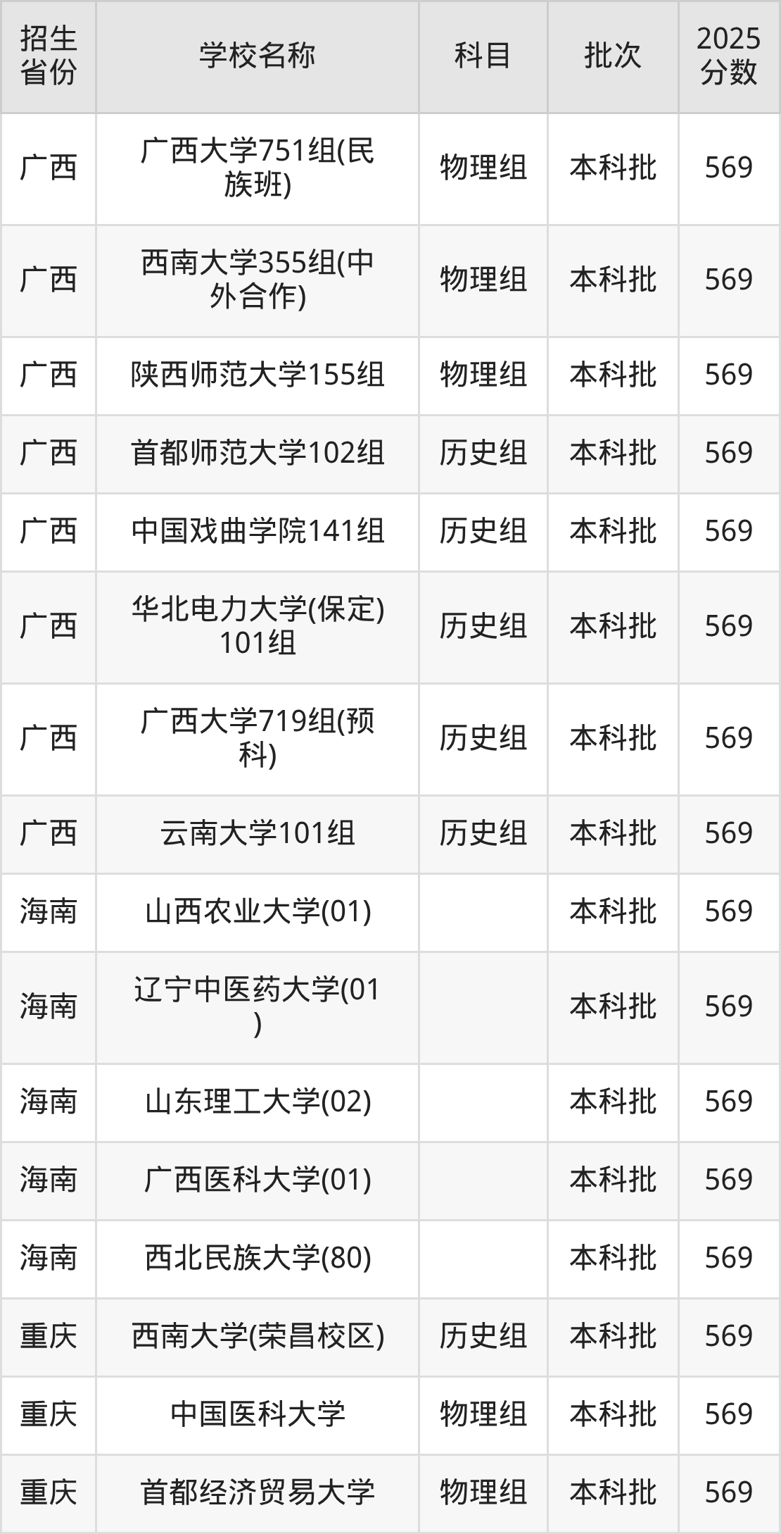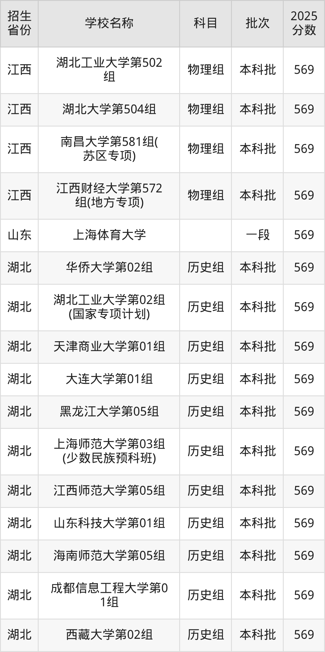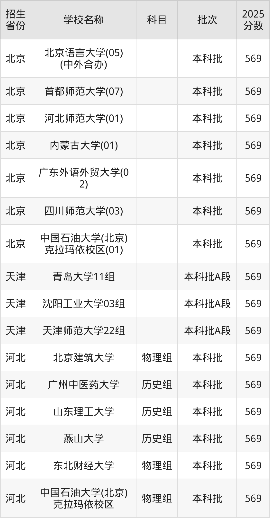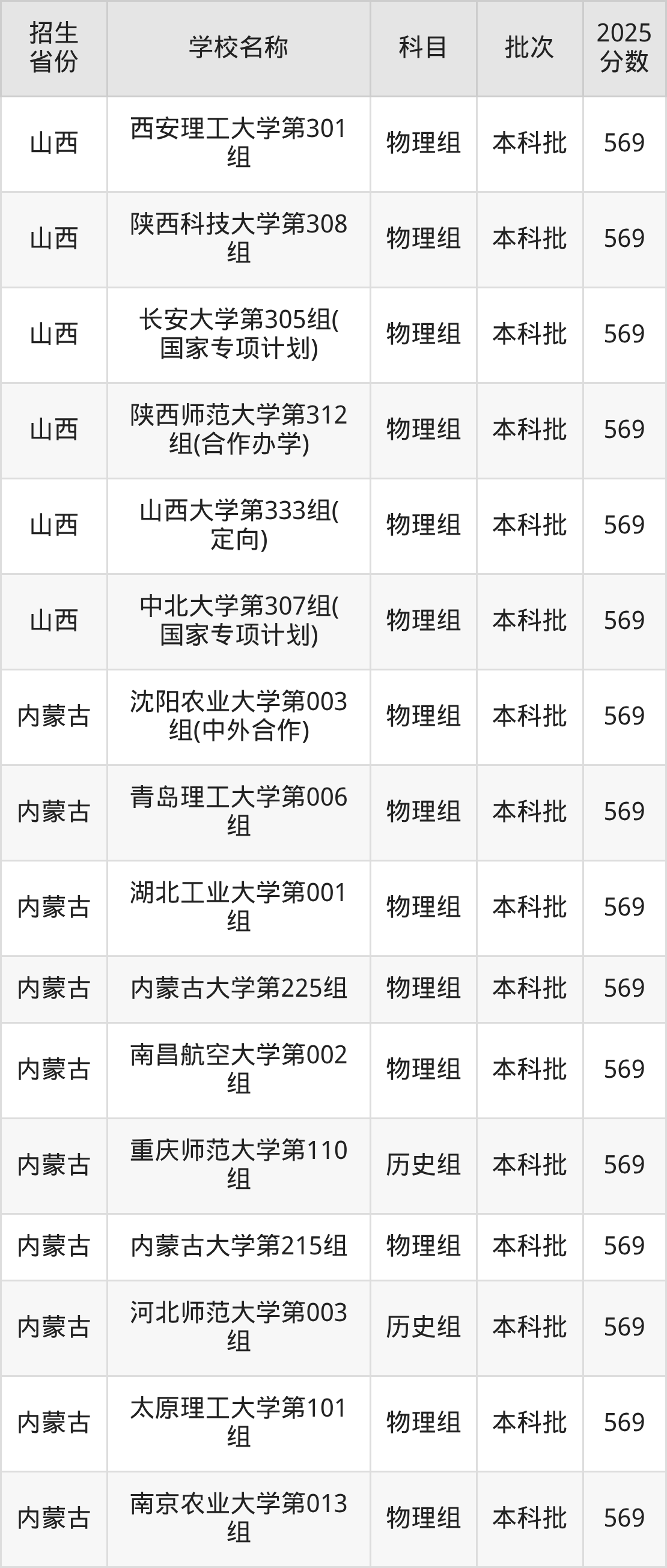 筛选全国各省2025年录取分数线为569分的重点大学如下: