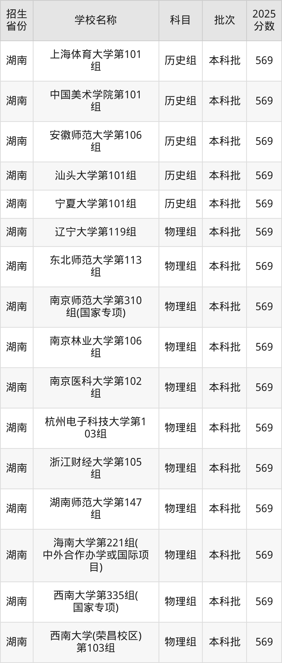 湖南省物理组分数线是569分的重点大学有:辽宁大学、东北师范大学、南京师范大学、南京林业大学、南京医科大学、杭州电子科技大学、浙江财经大学、湖南师范大学、海南大学、西南大学。