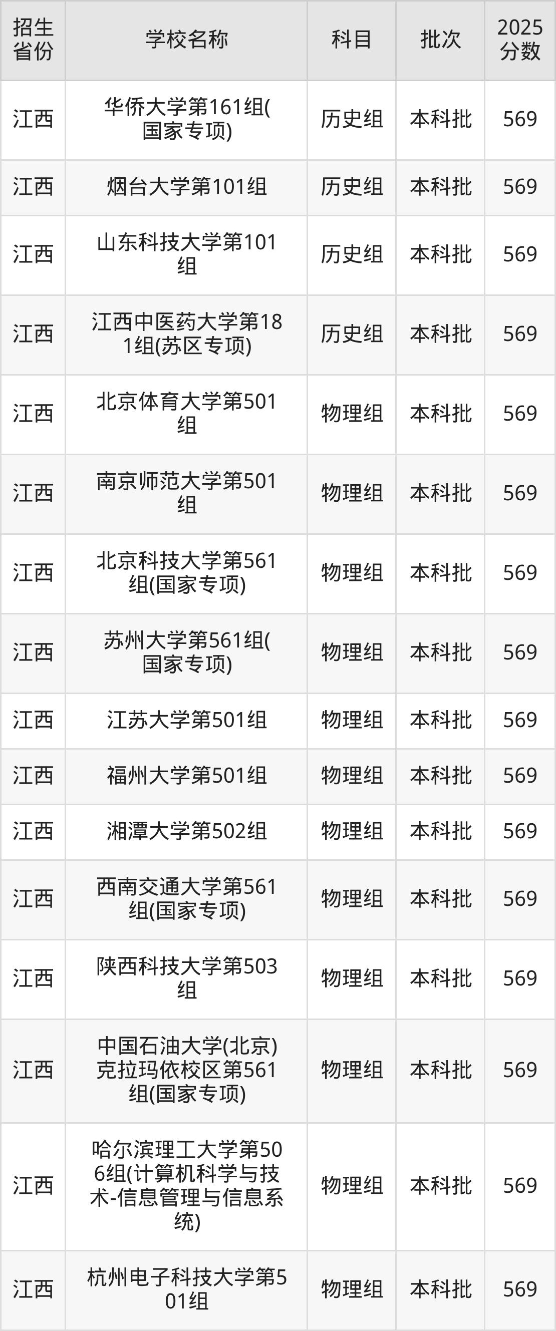 江西省历史组分数线是569分的重点大学有:广西师范大学、四川师范大学、石家庄铁道大学、燕山大学、辽宁大学、北京工商大学、天津科技大学、安徽财经大学、华侨大学、烟台大学。