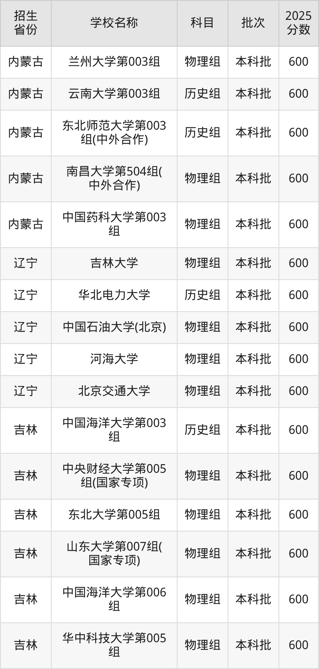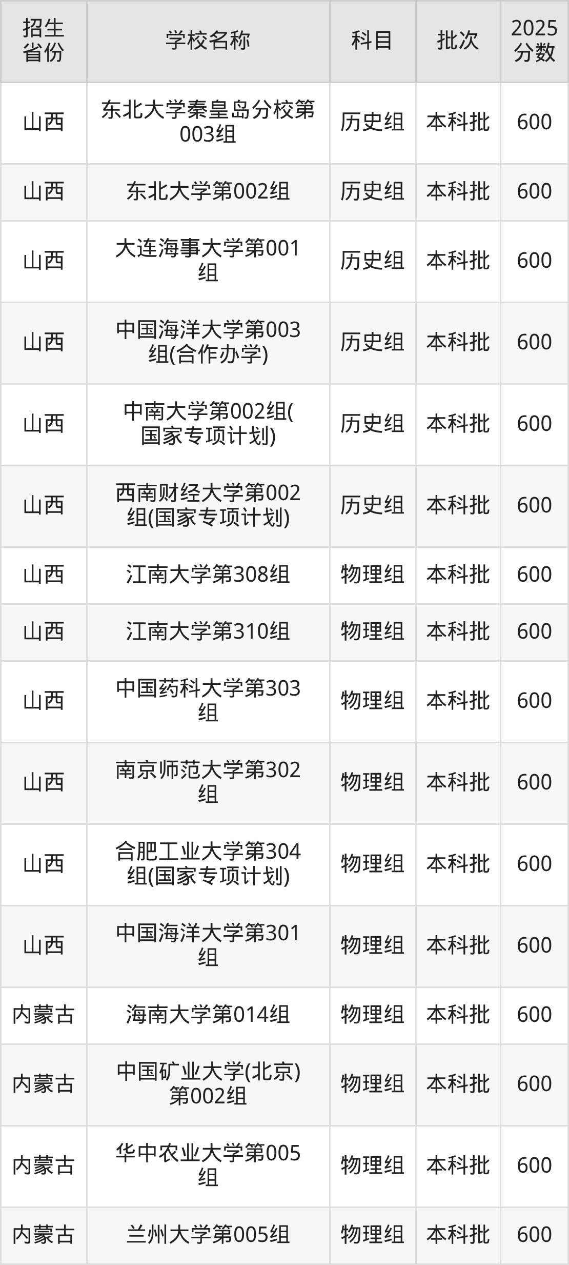 筛选全国各省2025年录取分数线为600分的211大学如下: