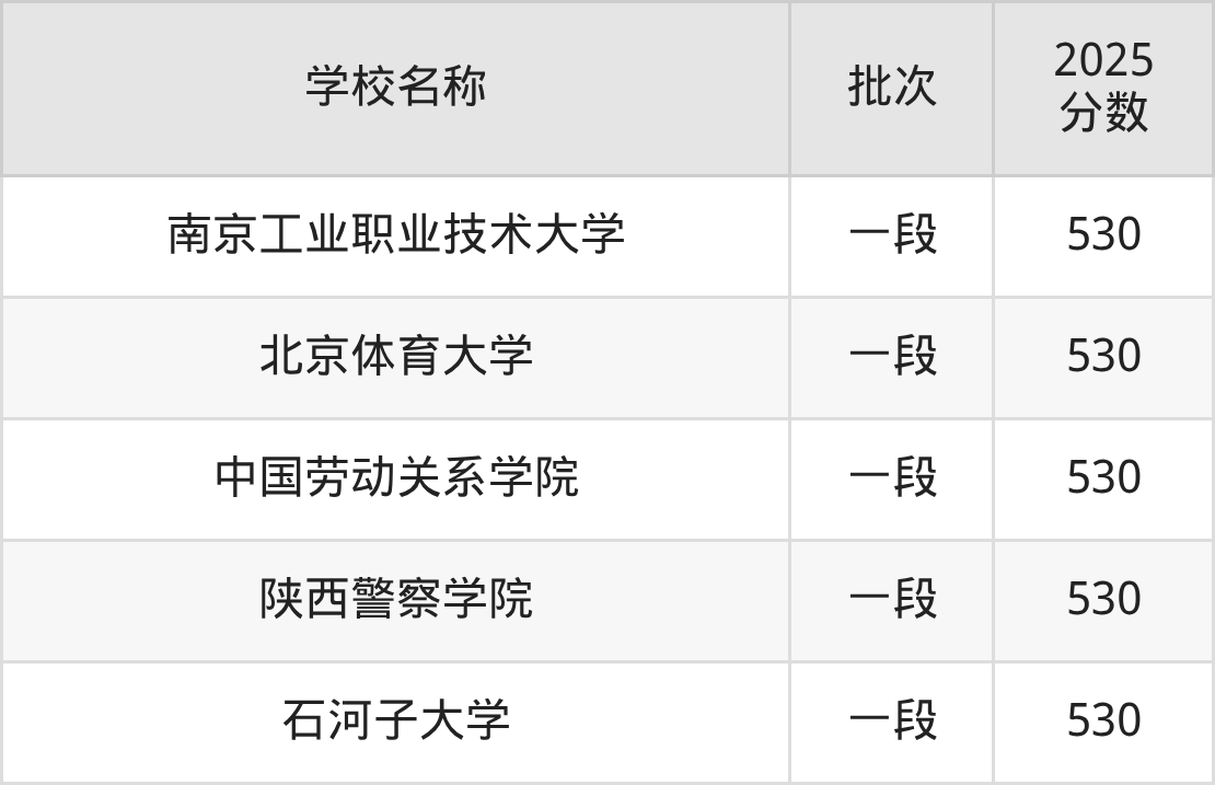 山东高考录取分数线在530分左右的公办大学一共有5所。分别是南京工业职业技术大学(530分)、北京体育大学(530分)、中国劳动关系学院(530分)