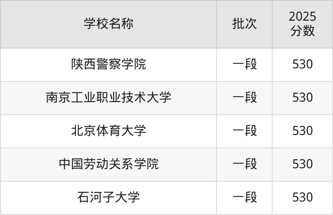山东高考录取分数线在530分左右的公办大学一共有5所。分别是陕西警察学院(530分)、南京工业职业技术大学(530分)、北京体育大学(530分)