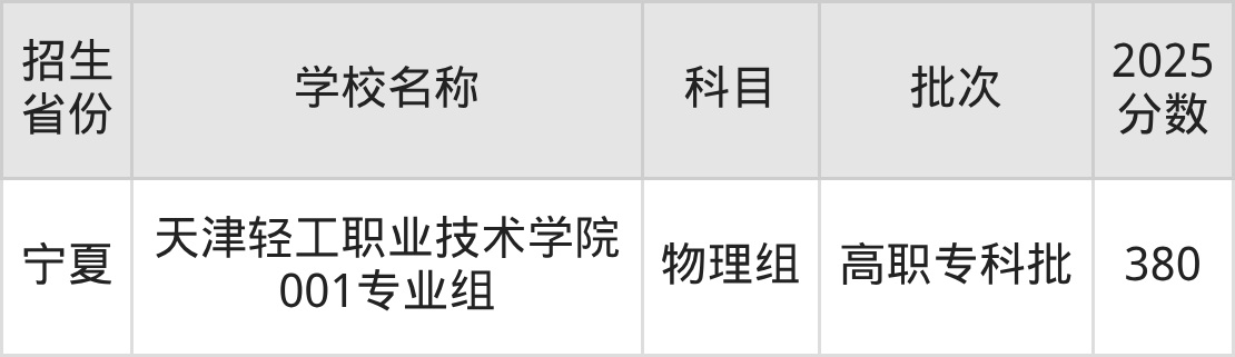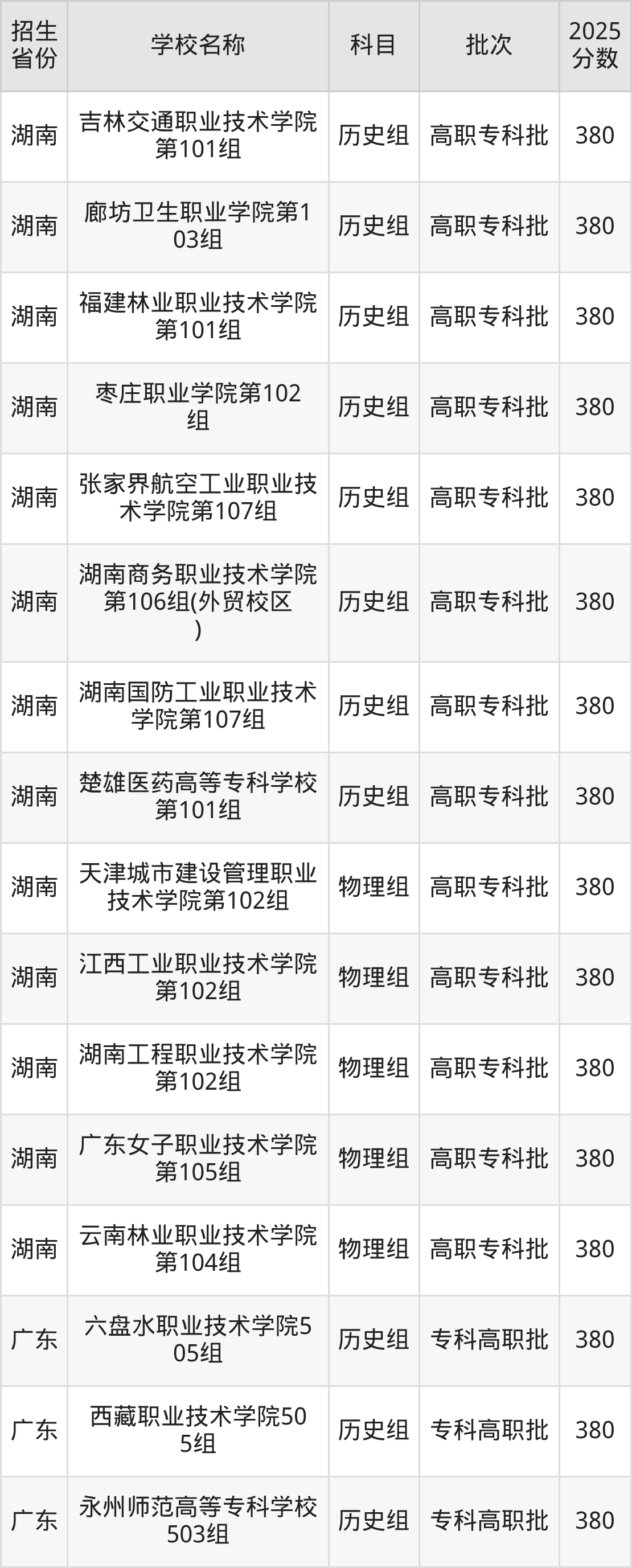 湖南省物理组分数线是380分的公办专科大学有:天津城市建设管理职业技术学院、江西工业职业技术学院、湖南工程职业技术学院、广东女子职业技术学院、云南林业职业技术学院。