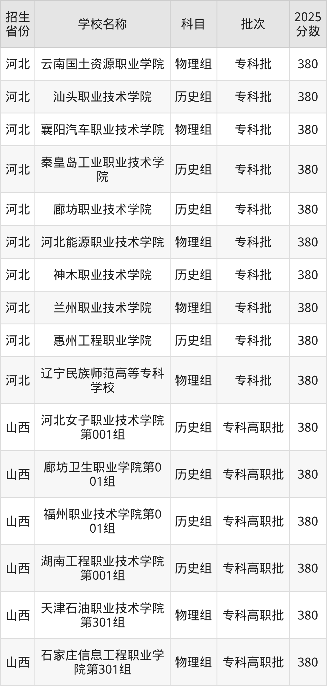 河北省历史组分数线是380分的公办专科大学有:汕头职业技术学院、秦皇岛工业职业技术学院、廊坊职业技术学院、神木职业技术学院、惠州工程职业学院。