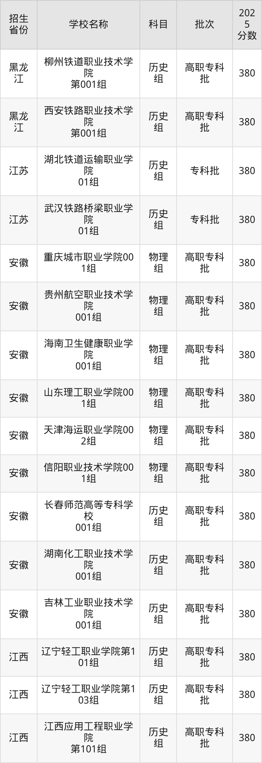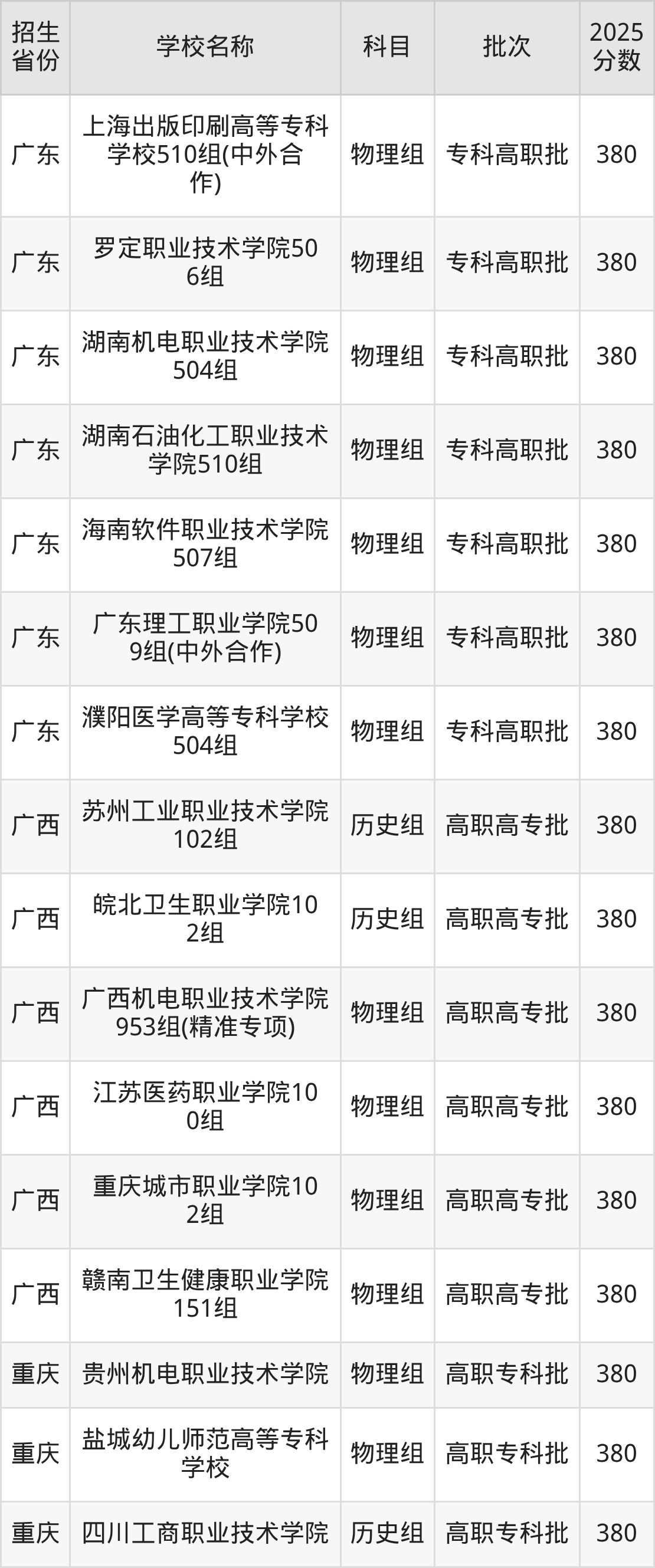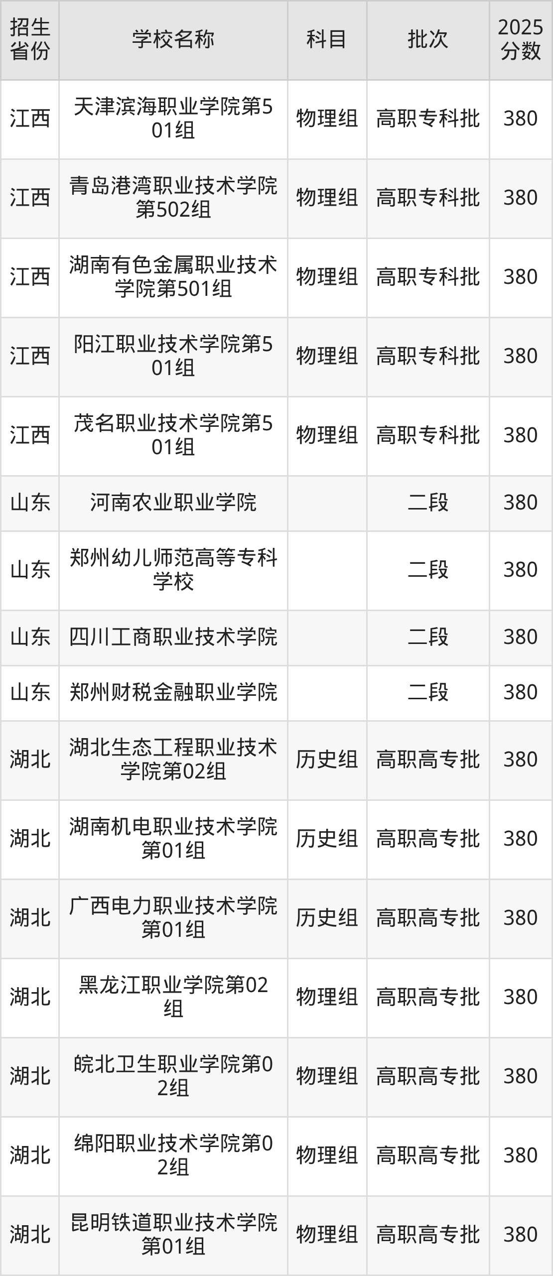 筛选全国各省2025年录取分数线为380分的公办专科大学如下: