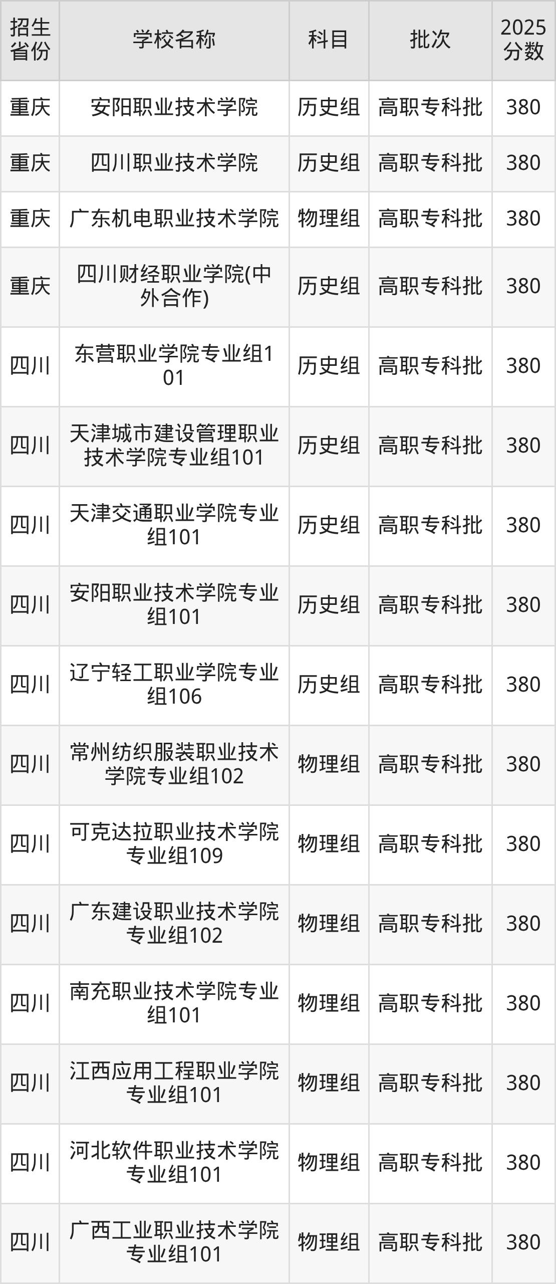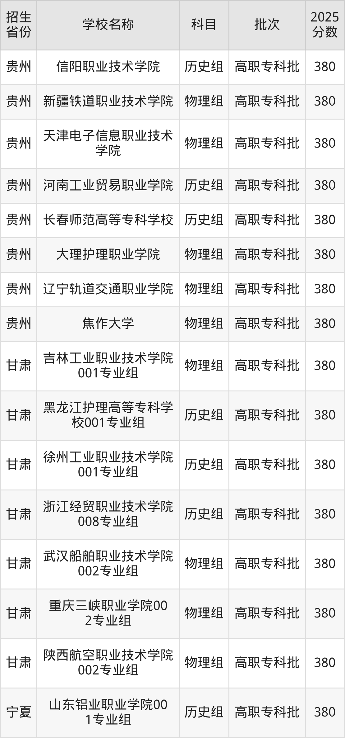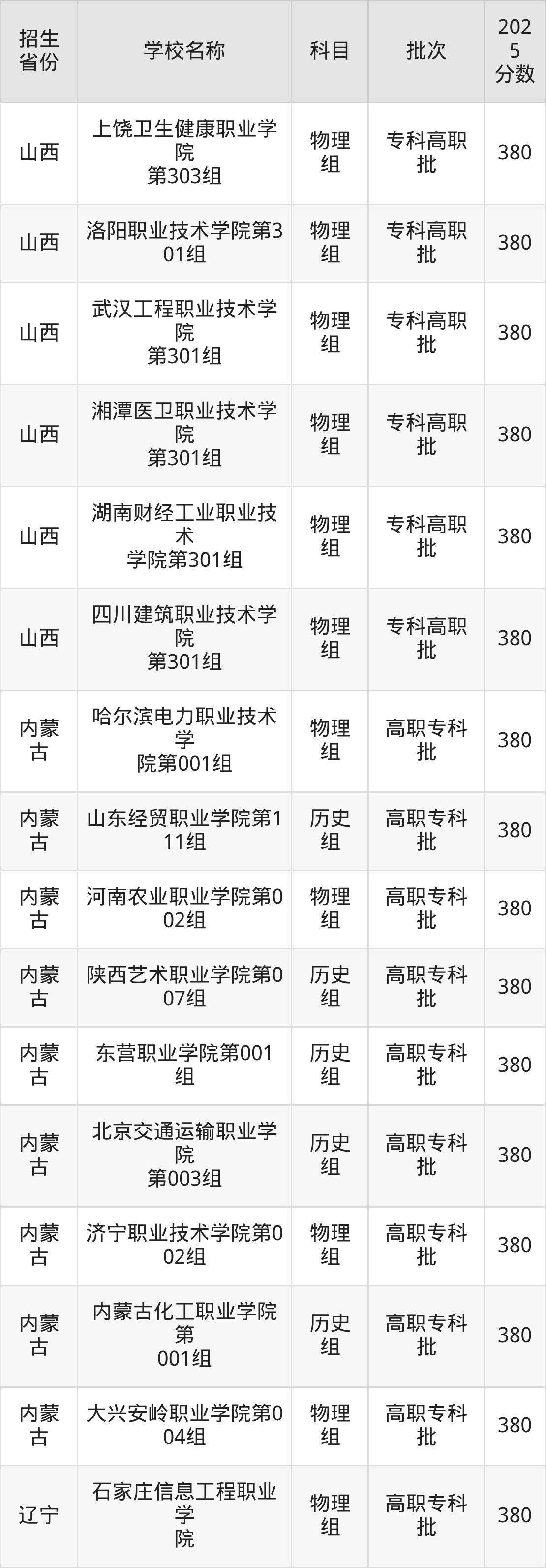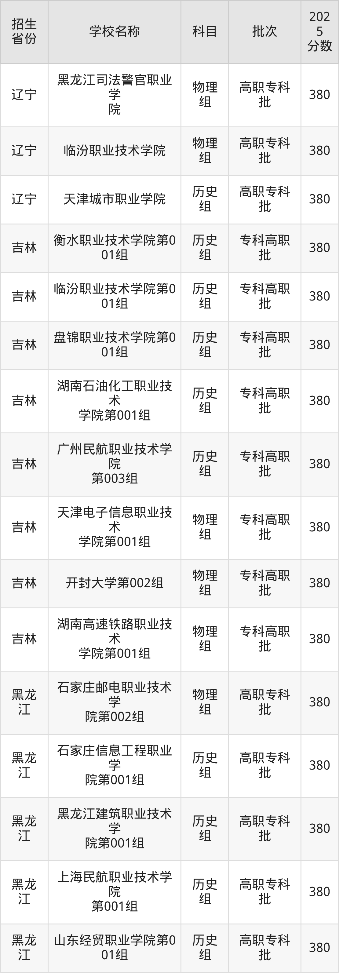 筛选全国各省2025年录取分数线为380分的公办专科大学如下:
