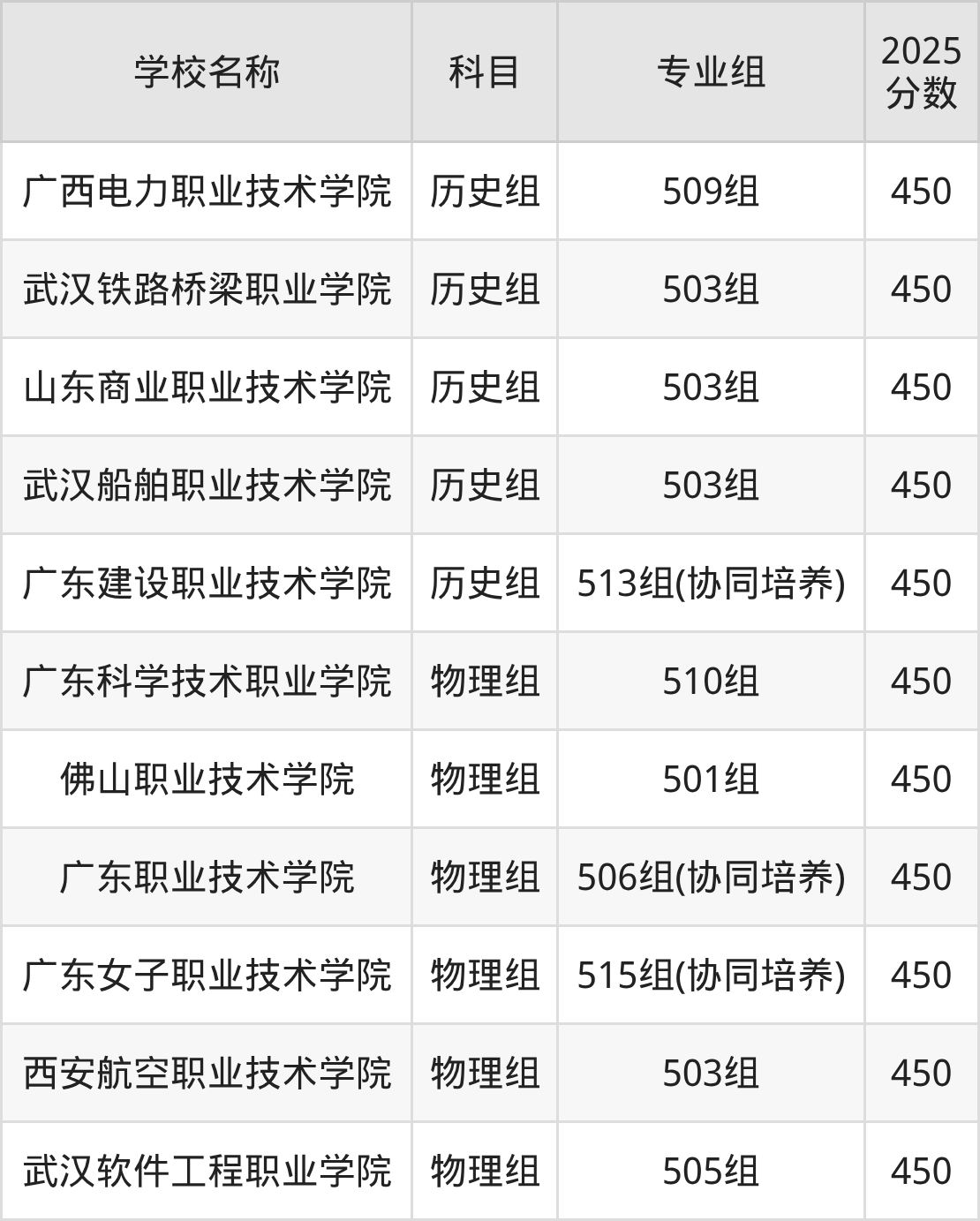 广东高考录取分数线在450分左右的公办院校专业组一共有11个,其中历史组有:广西电力职业技术学院(450分)、武汉铁路桥梁职业学院(450分)、山东商业职业技术学院(450分),物理组有:广东科学技术职业学院(450分)、佛山职业技术学院(450分)、广东职业技术学院(450分)。