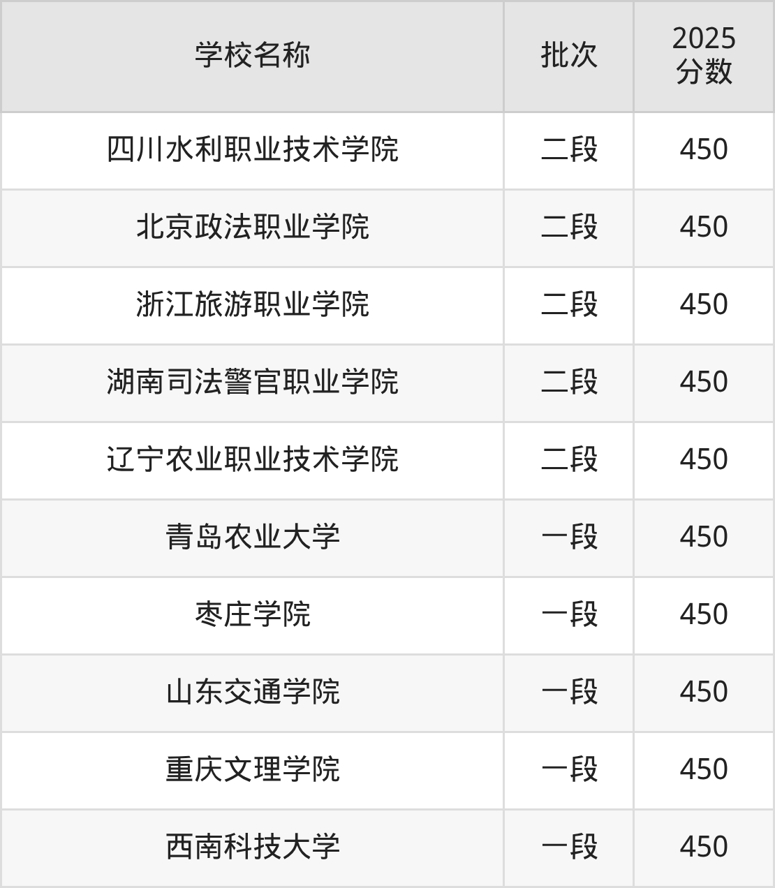 山东高考录取分数线在450分左右的公办大学一共有10所。分别是四川水利职业技术学院(450分)、北京政法职业学院(450分)、浙江旅游职业学院(450分)