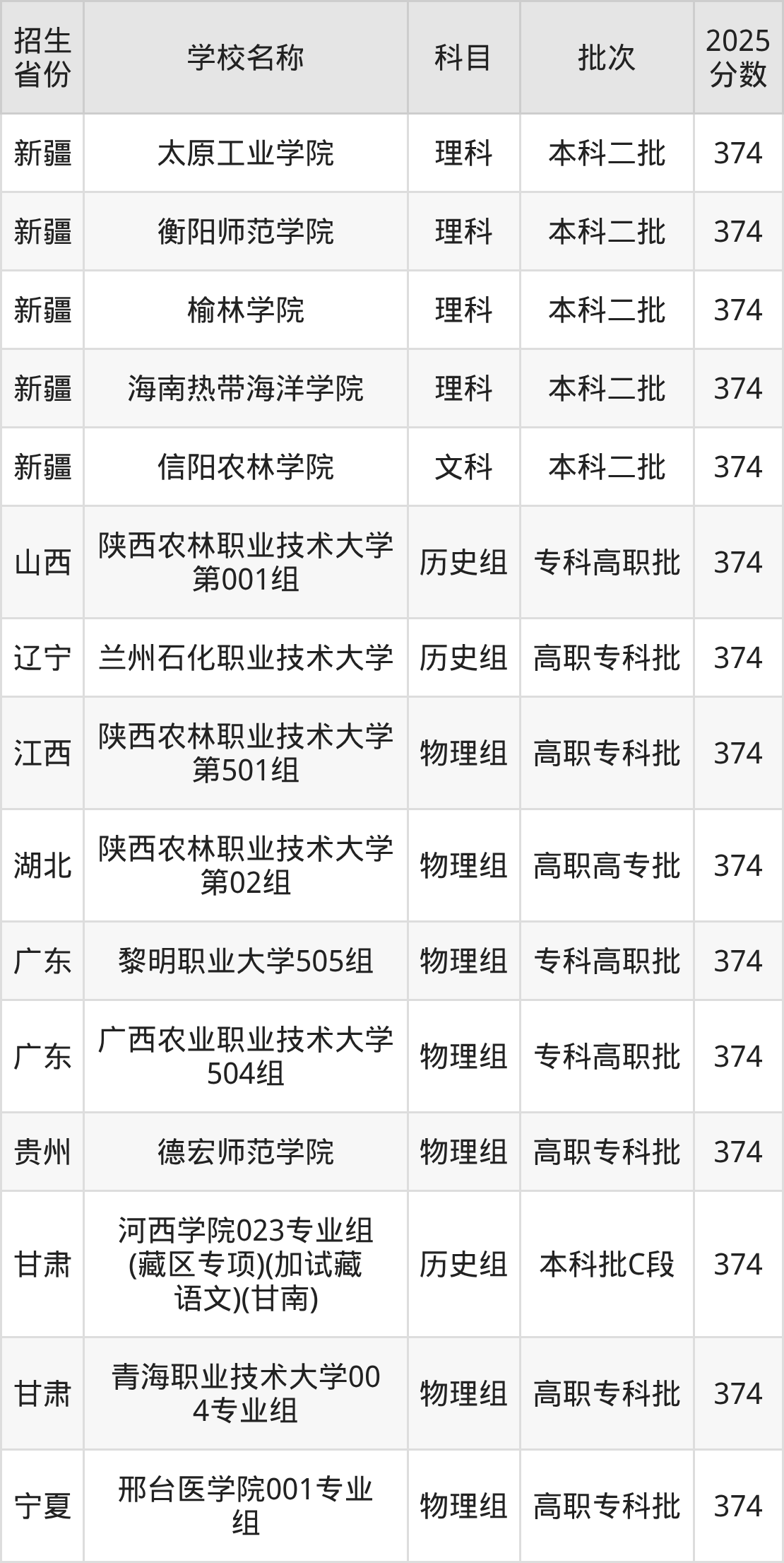 二、各省374分的二本公办大学名单