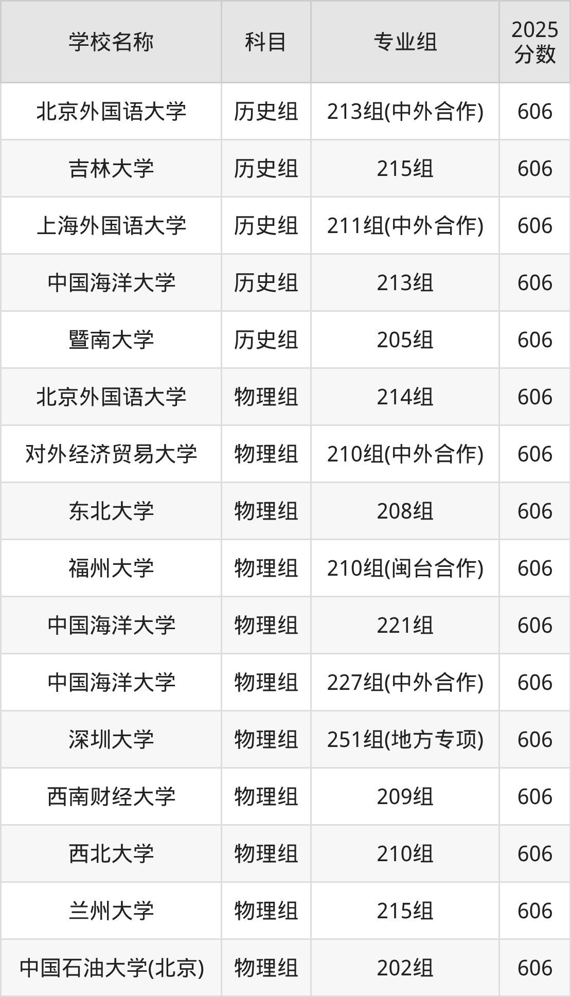 广东高考录取分数线在606分左右的公办院校专业组一共有16个,其中历史组有:北京外国语大学(606分)、吉林大学(606分)、上海外国语大学(606分),物理组有:北京外国语大学(606分)、对外经济贸易大学(606分)、东北大学(606分)。