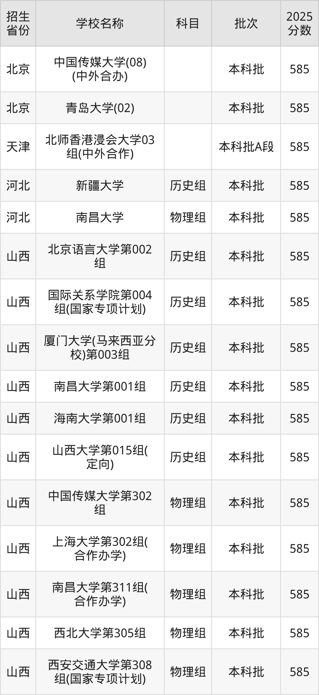 山西省物理组分数线是585分的文科大学有:中国传媒大学、上海大学、南昌大学、西北大学、西安交通大学。