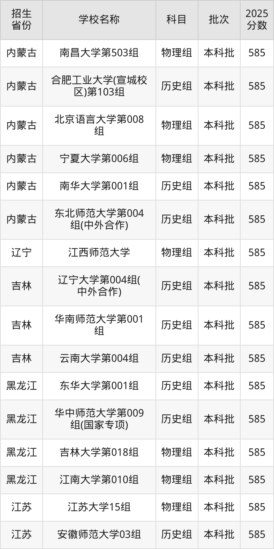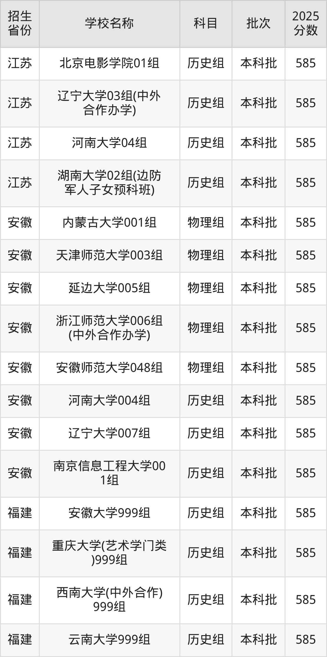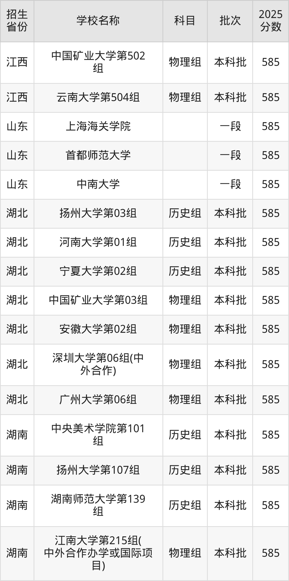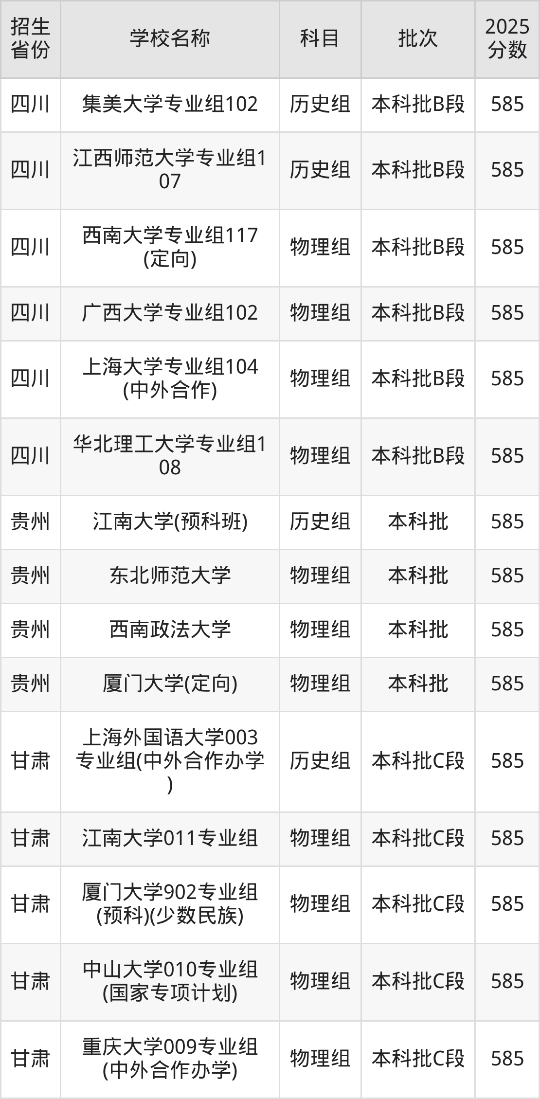 二、各省585分的文科大学名单