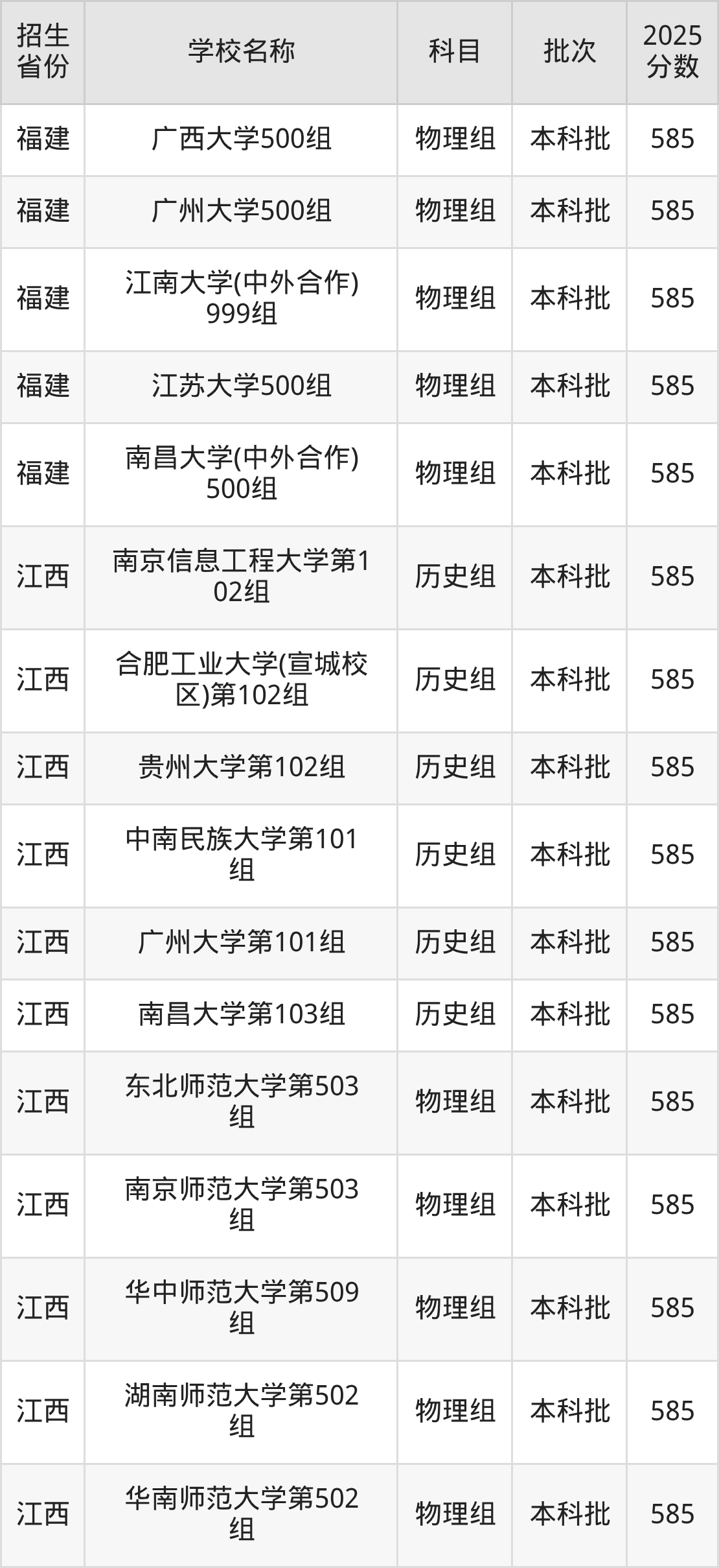江西省历史组分数线是585分的文科大学有:南京信息工程大学、合肥工业大学(宣城校区)、贵州大学、中南民族大学、广州大学、南昌大学。
