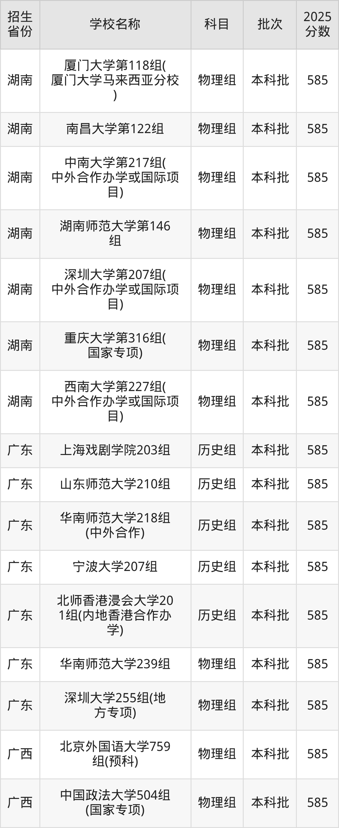 筛选全国各省2025年录取分数线为585分的文科大学如下: