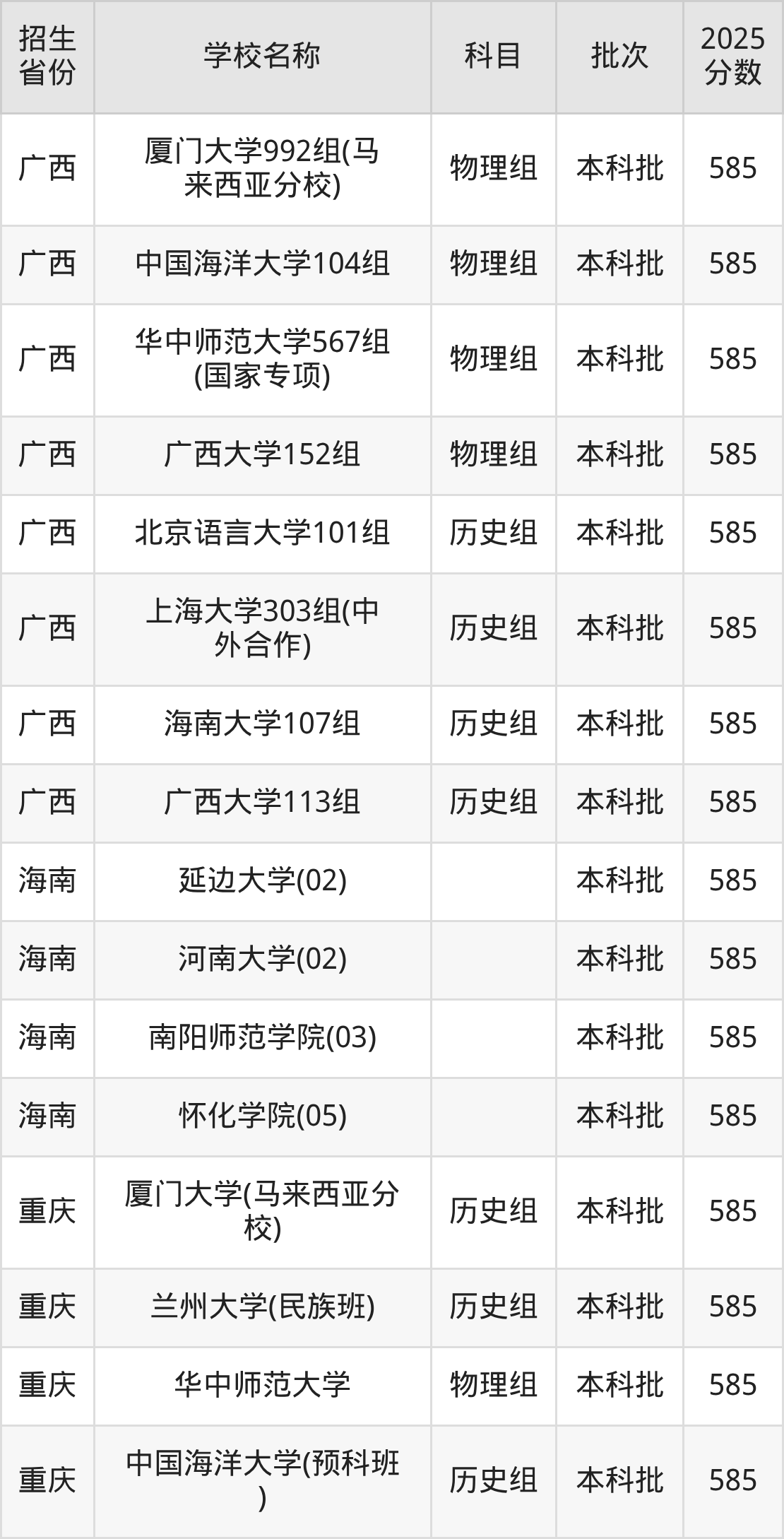 广西壮族自治区物理组分数线是585分的文科大学有:北京外国语大学、中国政法大学、厦门大学、中国海洋大学、华中师范大学、广西大学。