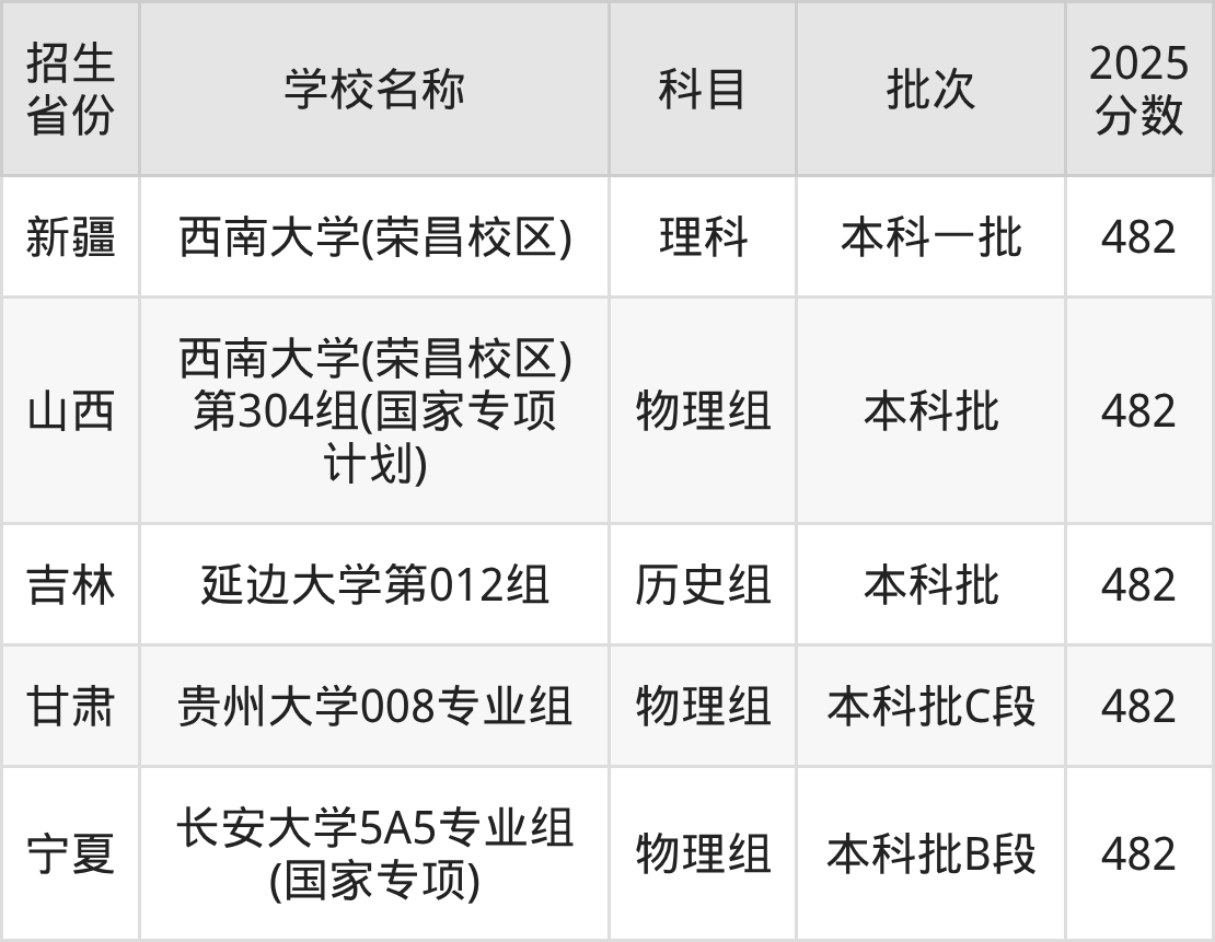 筛选全国各省2025年录取分数线为482分的211大学如下: