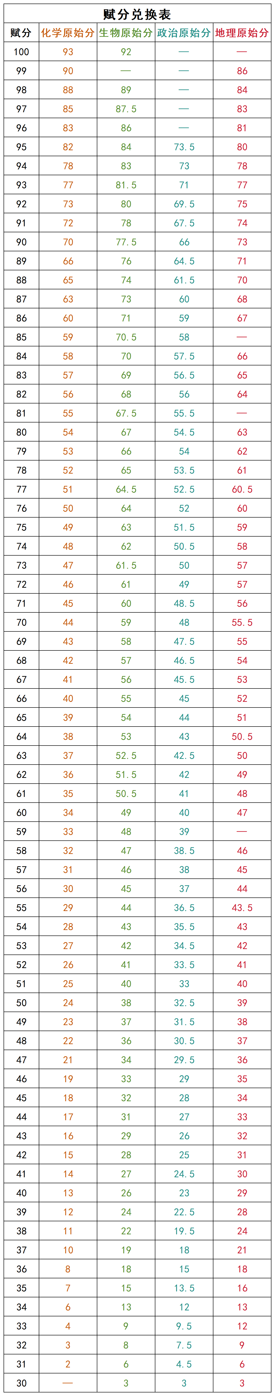地理:原始分89.5-90分赋分100分、87.5-89分赋分99分、85.5-87分赋分98分、83.5-85分赋分97分。