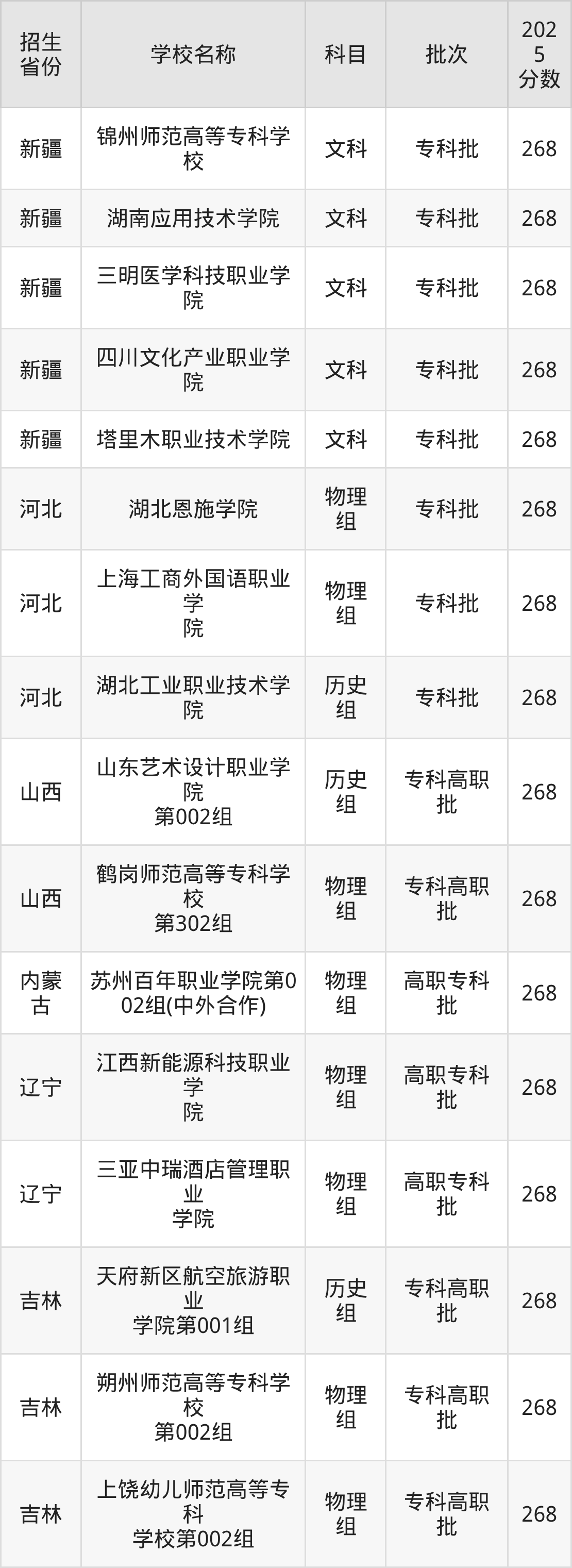 筛选全国各省2025年录取分数线为268分的文科大学如下: