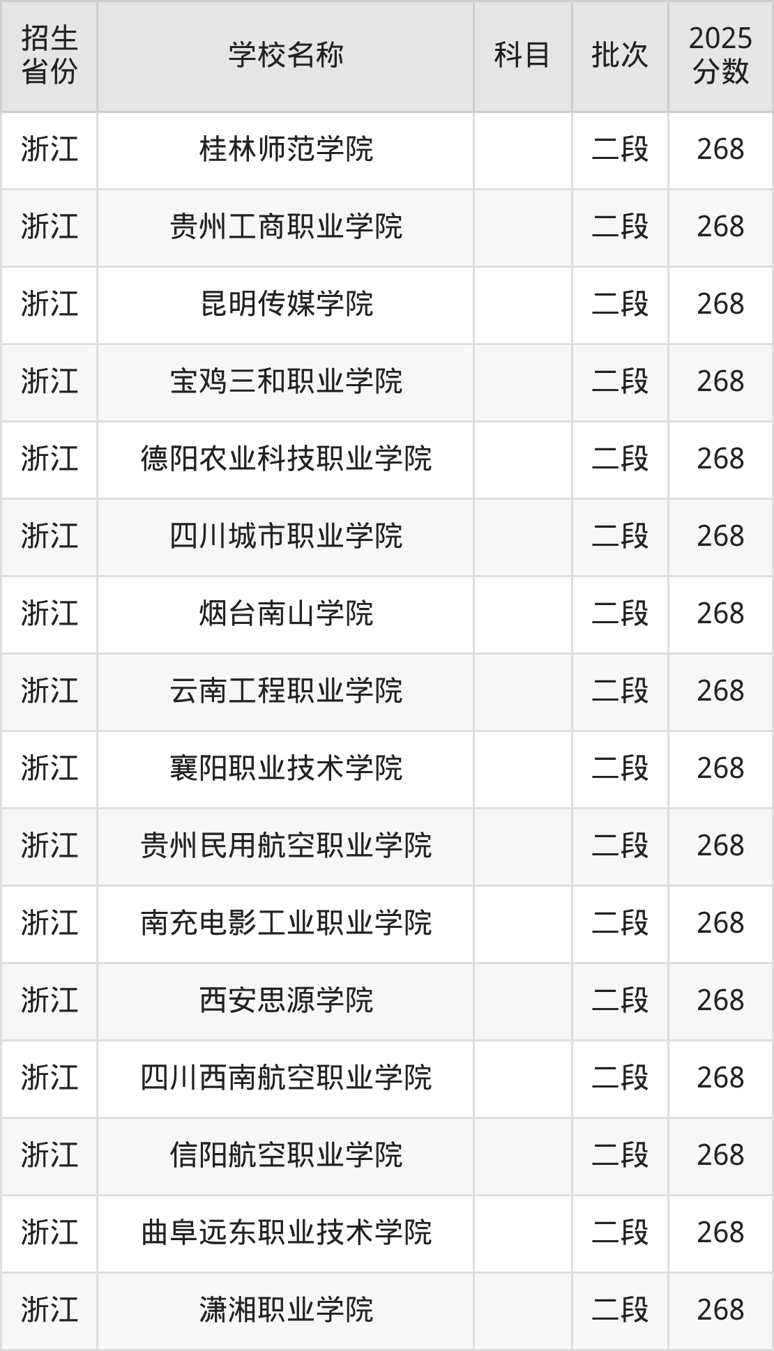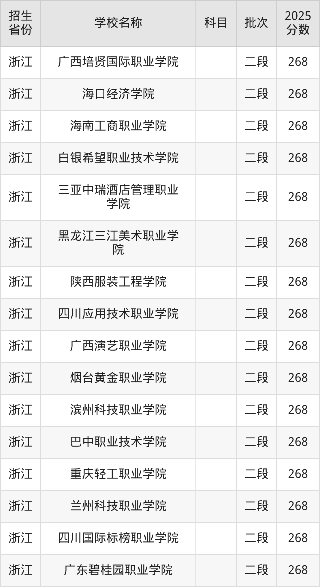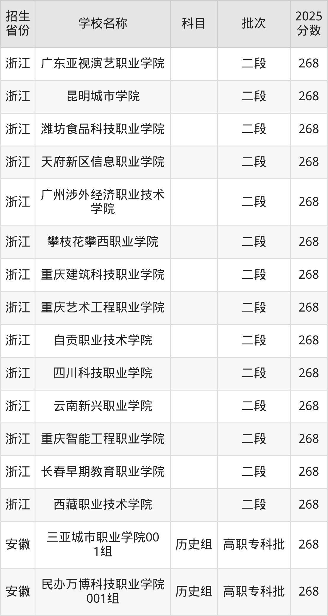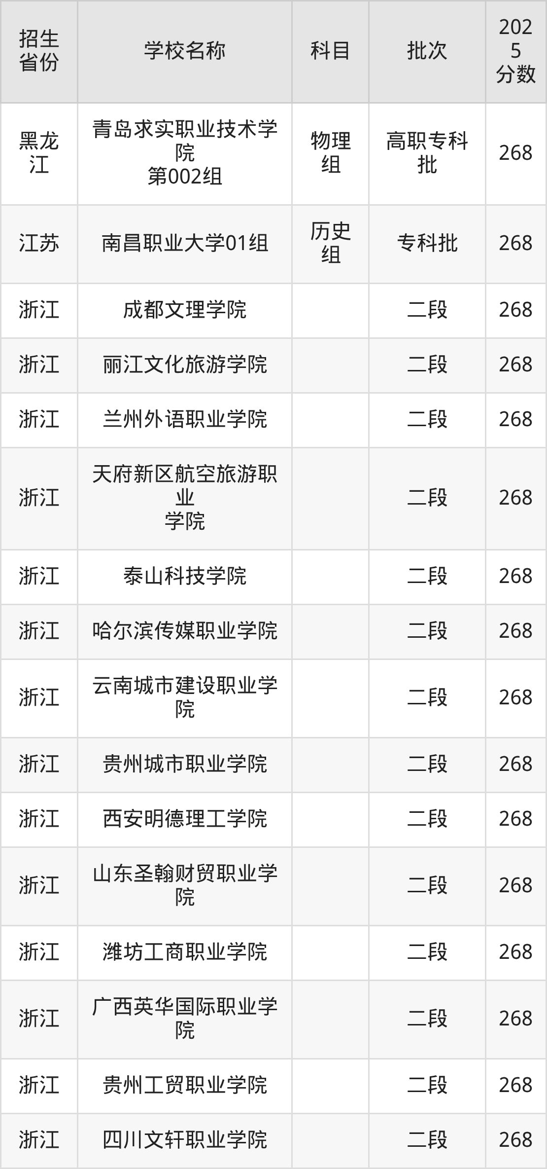 浙江省分数线是268分的文科大学有:成都文理学院、丽江文化旅游学院、兰州外语职业学院、天府新区航空旅游职业学院、泰山科技学院、哈尔滨传媒职业学院、云南城市建设职业学院、贵州城市职业学院、西安明德理工学院、山东圣翰财贸职业学院。