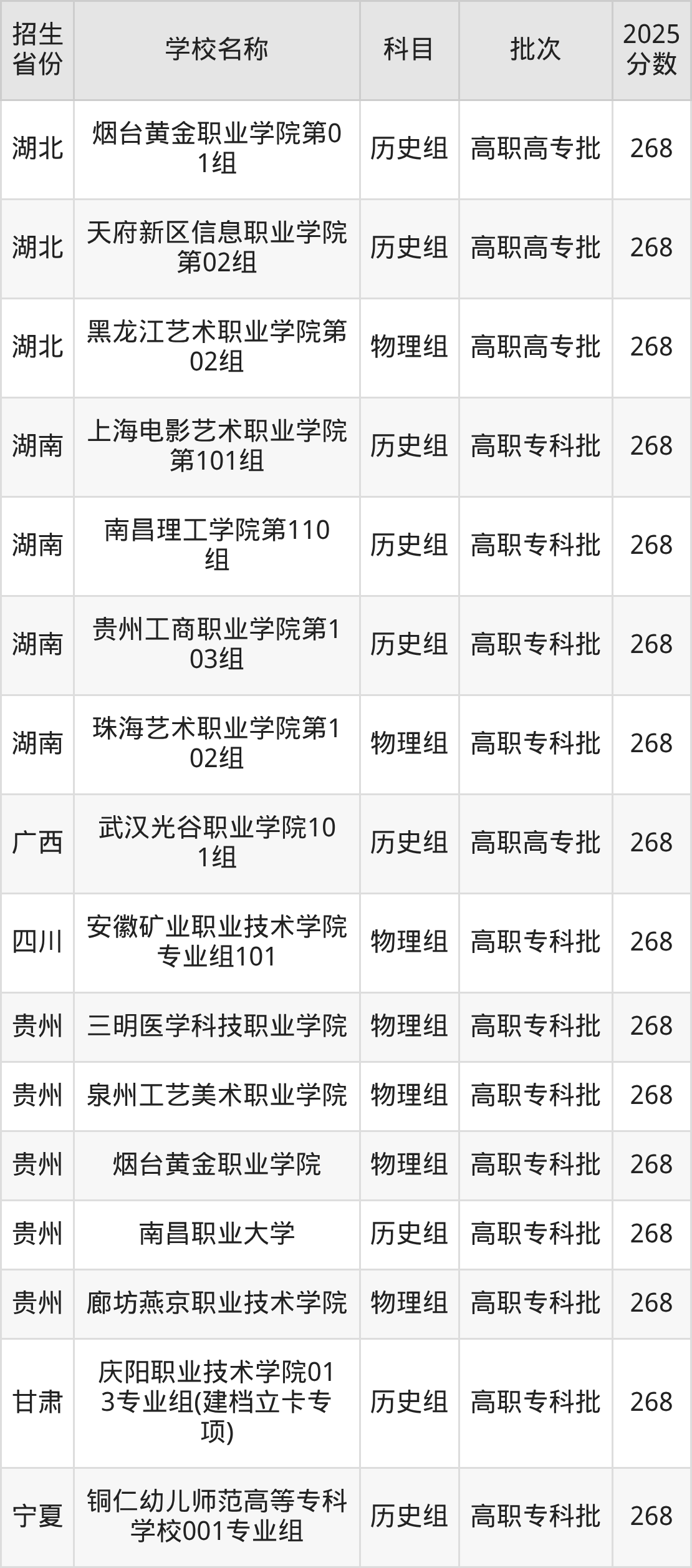 贵州省历史组分数线是268分的文科大学有:南昌职业大学。