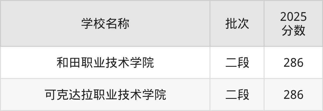 山东高考录取分数线在286分左右的公办大学一共有2所。分别是和田职业技术学院(286分)、可克达拉职业技术学院(286分)