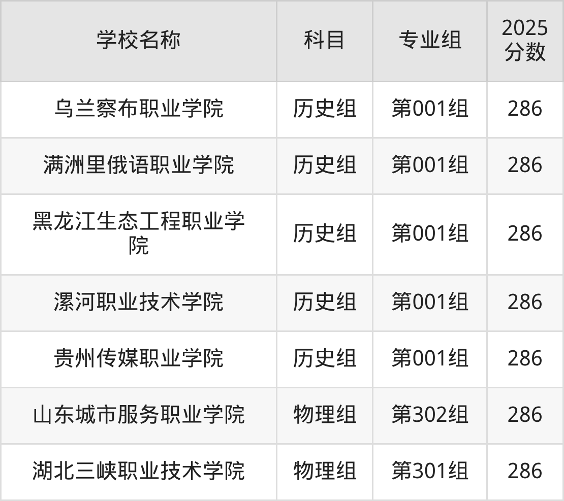 山西高考录取分数线在286分左右的公办院校专业组一共有7个,其中历史组有:乌兰察布职业学院(286分)、满洲里俄语职业学院(286分)、黑龙江生态工程职业学院(286分),物理组有:山东城市服务职业学院(286分)、湖北三峡职业技术学院(286分)。