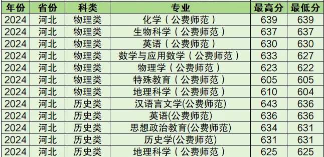 2024年河北地方公费师范大学的录取分数线如下(篇幅有限,仅列举2所院校分数)